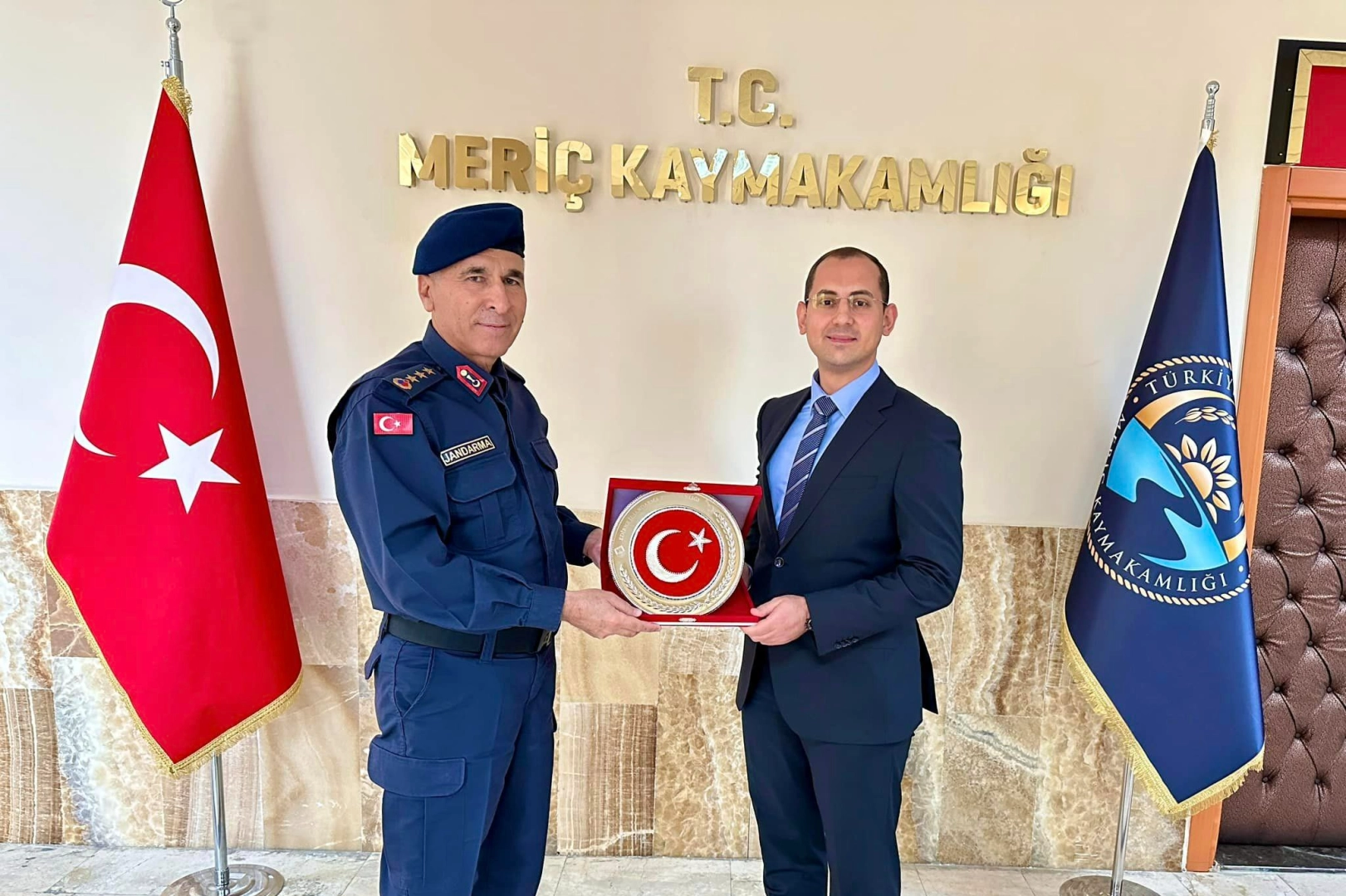 Edirne İl Jandarma Komutanı Kd. Albay Hacı Ali Büber ziyaret anısına Kaymakam Özgü Özen’e plaket takdim etti. Ziyarette Meriç ilçesinin genel asayiş ve güvenlik konuları istişare edildi.