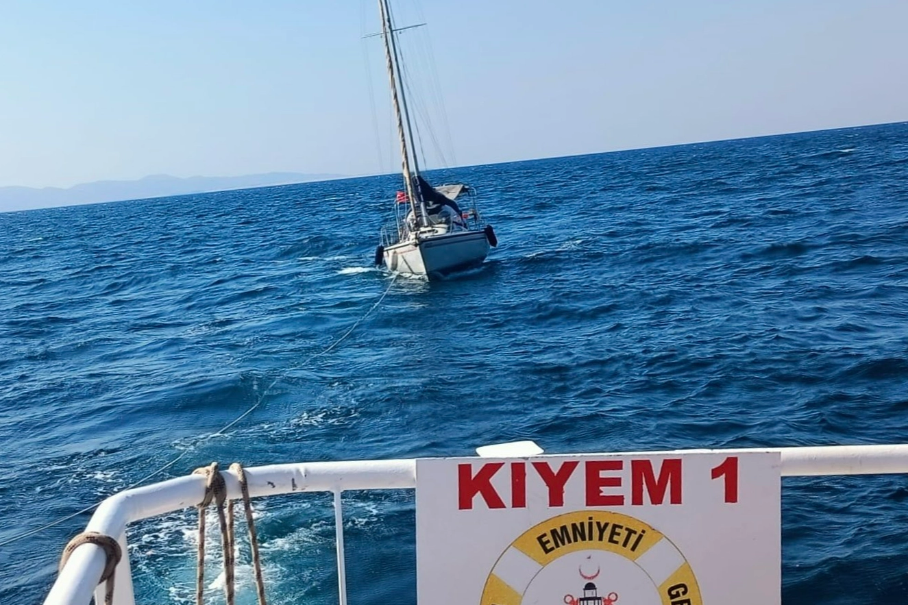 İçinde 2 kişinin bulunduğu tekne, arızanın giderilmesi için yedeklenerek Çanakkale'ye götürüldü.
