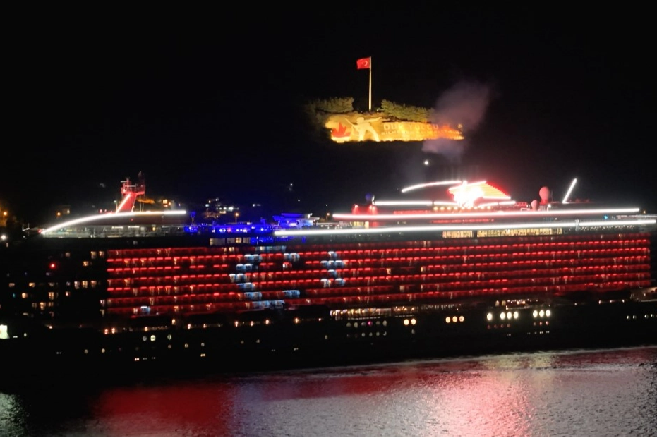 Çanakkale Boğazı'ndan dün saat 22.00 sıralarında Bahamalar bayraklı 277 metre boyunda 42 metre uzunluğundaki 2 bin 572 yolcu kapasiteli 'Resilient Lady' isimli kruvaziyer gemisi geçiş yaptı. Çanakkale önlerine gelen kruvaziyer gemisinin ışıkları Türk bayrağı şeklinde ışıklandırıldı. Çanakkale'yi Türk bayrağı ile selamlayan geminin boğazdan geçişi vatandaşlar tarafından ilgiyle izlendi.