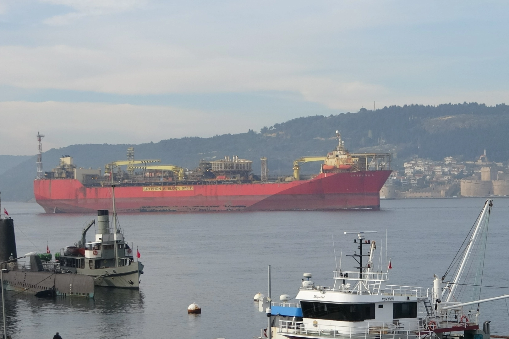 İngiltere’den Yalova’ya gitmek üzere yola çıkan ve dev bir FPSO, yani yüzer üretim, depolama ve boşaltma gemisi olarak hizmet veren ‘GRYPHON A’ isimli gemi, Çanakkale Boğazı güneyinden saat 08.45’te geçiş yaptı. Devasa boyutları ve üretim kapasitesiyle dikkat çeken gemi, boğazdan geçişi sırasında vatandaşların ilgisini çekti. Birleşik Krallık bayraklı 258 metre uzunluğa ve 41 metre genişliğe sahip olan yüzer üretim, depolama ve boşaltma gemisi ‘GRYPHON A’nın Çanakkale Boğazı’ndan Kıyı Emniyeti Genel Müdürlüğüne (KEGM) bağlı ‘NENE HATUN’, ‘KURTARMA 16’ romorkörleri refakatinde ve Malta bayraklı ‘BOKA SWEEPER’ isimli gemi ile çekilerek geçiş yaptı. Boğazın manevra yapılması en güç noktası Nara Burnu'nu dönen gemi, Marmara Denizi'ne doğru yol aldı. Çanakkale Boğazı geminin geçişişi sırasında kuzey-güney tek yönlü olarak gemi trafiğine kapatıldı.