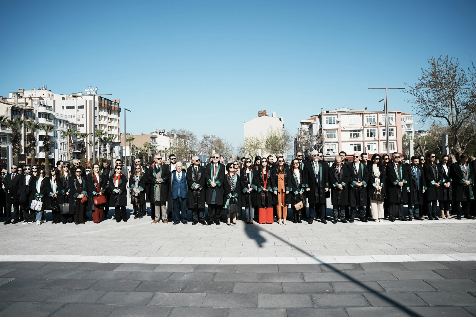 Çanakkale Baro Başkanı Ardahan Dikme ile baro mensubu avukatlar, Cumhuriyet Meydanı'nda toplandı. Dikme'nin Atatürk Anıtı'na çelenk sunmasının ardından saygı duruşunda bulunuldu, İstiklal Marşı okundu.