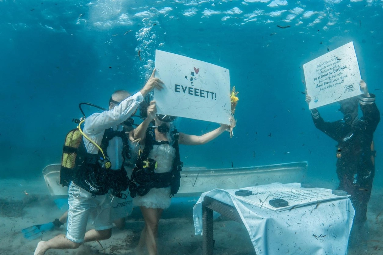 Çift, su altında "Evet" yazılı pankart açtıktan sonra kıyıya çıkarak misafirlerin önünde de nikah defterine imza attı.