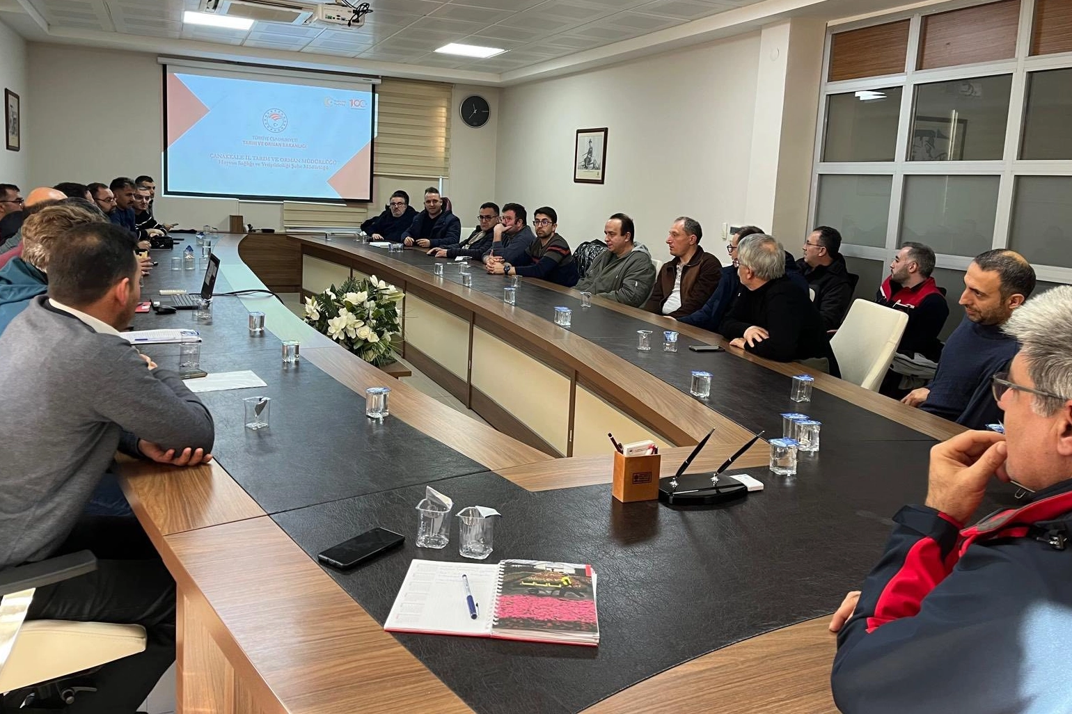 Çanakkale İl Tarım ve Orman Müdürlüğü toplantı salonunda, il ve ilçe Tarım ve Orman Müdürlüğü personelinin katılımıyla ‘Hayvan Hastalıkları ve Tedbirleri Konusunda Değerlendirme Toplantısı’ düzenlendi. Toplantıda, 2025 yılı içerisinde ilde görülen hayvan hastalıkları, muhtemel giriş ve çıkış yolları, alınabilecek tedbirler, sahada karşılaşılan eksik uygulamalar ile iyileştirici ve önleyici çalışmalar ele alındı. SAT-1 serotipi Şap Hastalığı ile mücadele çerçevesinde aşılama çalışmaları ve hayvan hareketlerinin kısıtlanması başta olmak üzere salgının kontrol altına alınmasına yönelik alınması gereken tedbirler değerlendirildi. Saha çalışmaları çerçevesinde; araç, ekip ve ekipman kapasitesinin etkin kullanımı, aşılamanın planlanan tarihlerde tamamlanması ve aşı zayiatının önlenmesi amacıyla köy, mahalle bazlı planlama yapılmasının önemi vurgulandı. Aşılama esnasında işletme hayvan varlığı güncelleme işlemlerinin mutlaka gerçekleştirilmesi gerektiği ifade edildi. Çanakkale’de görülen BTV-8 Serotipi Mavidil Hastalığı ile etkin mücadele için gelen ihbarların ivedilikle değerlendirilmesi, numune alınması ve aşı temininin ardından uçucu sineklerin aktif olduğu dönem öncesinde aşılama çalışmalarının tamamlanması gerektiği belirtildi. 2025 yılında aşılama oranlarının düşük kaldığı hastalıklar için programların titizlikle hazırlanması ve aşılama oranlarının istenilen seviyelere çıkarılmasına yönelik çalışmalar ele alındı. Toplantıda yapılan değerlendirmeler doğrultusunda 2026 yılı yol haritası oluşturuldu.