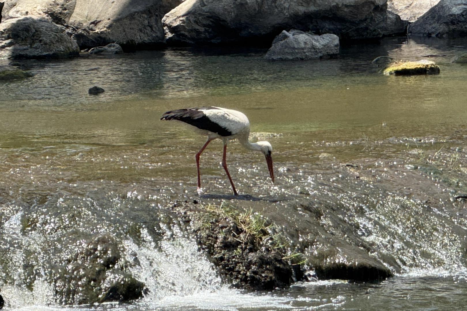 Bölgede bulunan aile çay bahçesi kenarından akan Kocabaş Çayı yatağında leylekler, yavrularını beslemek için avlanıyor.
