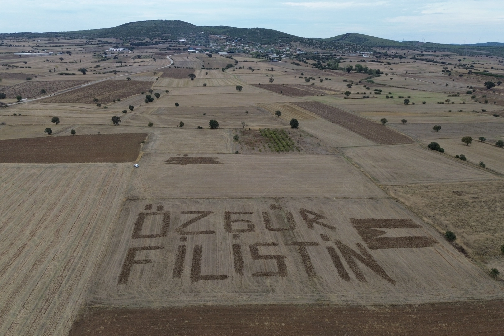 Eskibalıklı köyünde tarım ve hayvancılıkla uğraşan Hüseyin Savaş, 13 dönümlük tarlasına traktörle "Özgür Filistin" yazdığını söyledi.