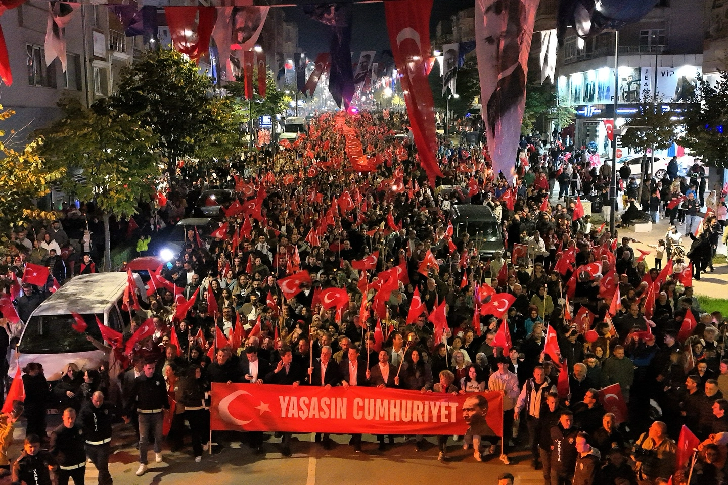 Çerkezköy’de Cumhuriyet Bayramı kutlamaları, binlerce kişinin katıldığı Fener Alayı ile başladı. Ellerinde meşaleler, yüreklerinde Cumhuriyet sevgisiyle yürüyen vatandaşlar, kenti kırmızı beyaza bürüdü.