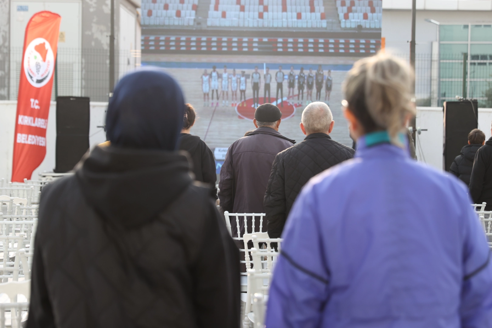 Kırklareli Belediyesi Fen Bilimleri Kadın Basketbol Takımı'nın seyircisiz oynama cezası nedeniyle Seçil Kauçuk Mersin Basketbol ile oynanan maç için Yeni Kırklareli Spor Salonu'nun bulunduğu alana dev ekran kuruldu.