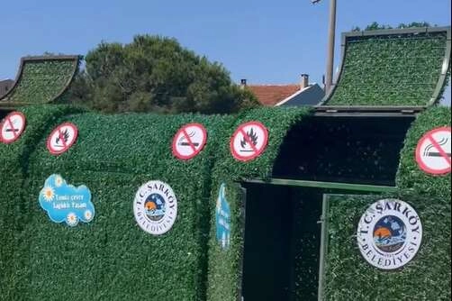 Tekirdağ'ın Şarköy ilçesinde bulunan çöp konteynerleri özel tasarımlı çim kafes giydirme çalışması ile estetik bir görünüme kavuşuyor.