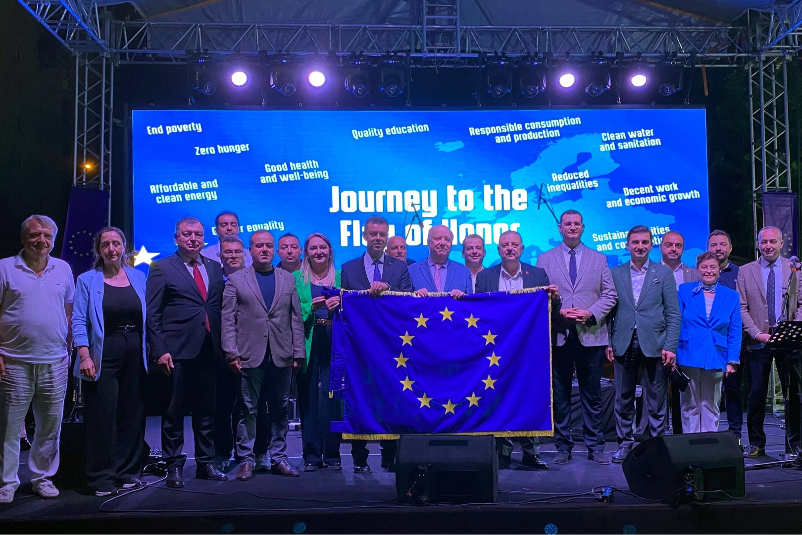 Avrupa Konseyi tarafından Avrupa Şeref Bayrağı Ödülü'ne layık görülen Çorlu'da ödül Nazım Hikmet Ran Parkı'nda düzenlenen törenle alındı. Törende Avrupa Konseyi Parlamenter Meclisi Avrupa Ödülü Alt Komitesi Üyesi Joseph O'Reilly, ödülü Çorlu Belediye Başkanı Ahmet Sarıkurt'a takdim etti. Çorlu'nun Avrupa Şeref Bayrağı Ödülü'ne giden sürece ilişkin sinevizyon gösterisi yapıldı.Törende konuşan başkan Sarıkurt, Avrupa ülkeleri ile yaptıkları çalışmaları anlatarak, "Avrupa Konseyi'nin; Avrupa değerlerine bağlılık, demokrasiye katkı, uluslararası iş birliğine açıklık ve toplumsal dayanışma gibi kriterlerle dayanarak Çorlu'muza layık gördüğü Avrupa Şeref Bayrağı ödülü, Çorlu'muzun dünya ile kurduğu güçlü bağların ve çağdaş vizyonunun bir göstergesidir. Her zaman üreten, düşünen, paylaşan, ortak akılla hareket eden bir kent olmayı hayal ettik. Bu hayalin peşinden koşarken yalnızca kendi sınırlarımız içinde değil; uluslararası düzeyde, şehirlerarası dostlukları güçlendiren, kültürler arası bağları çoğaltan bir anlayışı benimsedik. Avrupa şehirleri ile her zaman samimi ilişkiler kurduk; kardeş şehirlerimizle kültürel, sportif ve ekonomik iş birlikleri kurmaya özen gösterdik, yurt dışında ülkemizi en iyi şekilde temsil etmenin gururunu yaşadık" dedi.