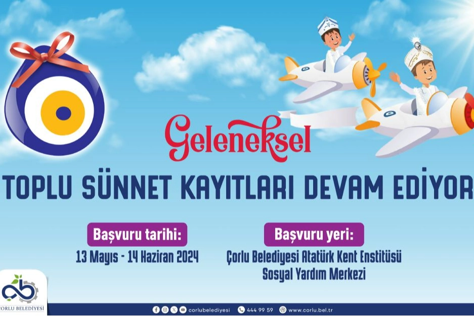 13 Mayıs 2024 Pazartesi günü başlayan toplu sünnet şöleni başvuruları, 14 Haziran 2024 Cuma günü sona erecek. 5-10 yaş arası çocuklarını sünnet ettirmek isteyen aileler, Şeyhsinan Mahallesi Kantarcı Sokak’ta bulunan Çorlu Belediyesi Atatürk Kent Enstitüsü'nde yer alan Sosyal Yardım Merkezi'ne başvuruda bulunarak kayıt yaptırabilecekler.
