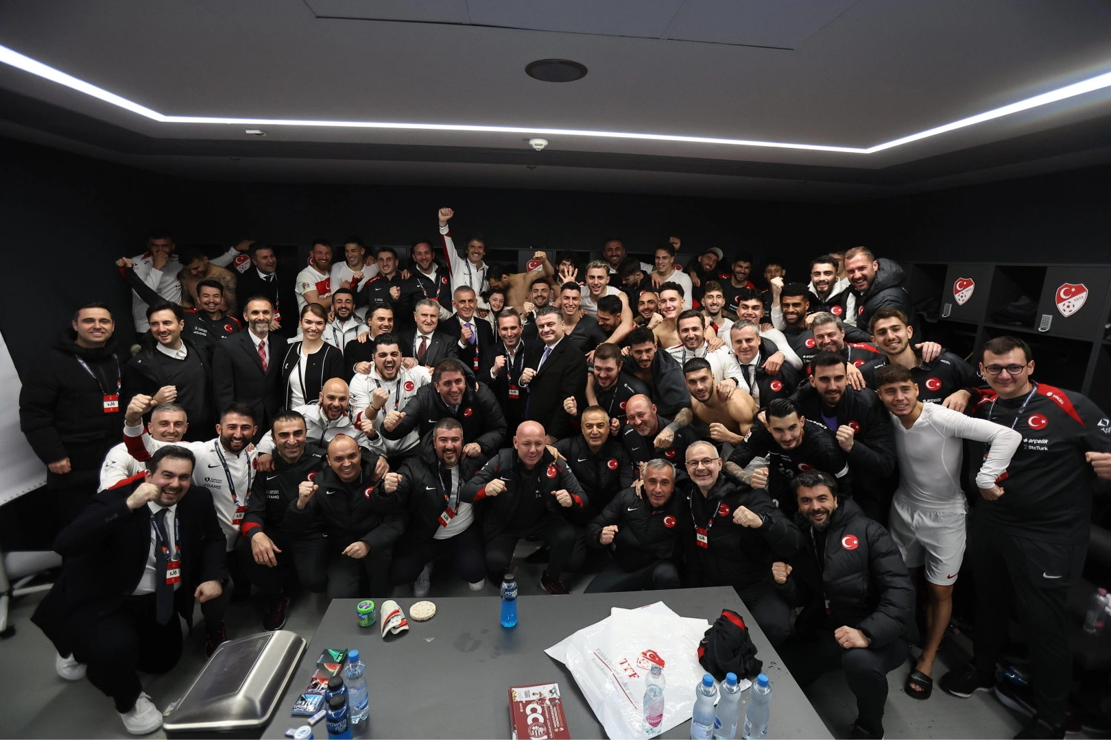 UEFA Uluslar Ligi play-off turu rövanş maçında Macaristan'ı eleyerek 3-0 mağlup eden A Milli Futbol Takımı tarihinde ilk kez A Ligi'ne yükselirken, Cumhurbaşkanı Recep Tayyip Erdoğan, ay-yıldızlı ekibi tebrik etti. Puskas Arena’da oynanan maçın ardından milli takımın soyunma odasında büyük sevinç yaşandı. Gençlik ve Spor Bakanı Osman Aşkın Bak, A Milli Takımı telefonla Cumhurbaşkanı Erdoğan ile görüştürdü. Teknik Direktör Vincenzo Montella ve Türkiye Futbol Federasyonu Başkanı İbrahim Hacıosmanoğlu ile konuşan Cumhurbaşkanı Erdoğan takıma tebriklerini iletti. Vincenzo Montella, Cumhurbaşkanı Erdoğan'a teşekkür edip, "Sayın Cumhurbaşkanım, çok güzel bir galibiyet aldık, umarım sizleri ve Türkiye’yi gururlandırmışızdır. Uzun zamandır, neredeyse üç senedir kendi evinde kaybetmeyen bir takımı yendik. Takımımız muazzam bir işe imza attı" diye konuştu. Cumhurbaşkanı Erdoğan ise "Tebrik ediyoruz, biz de sizinle gururlandık" dedi. Cumhurbaşkanı Erdoğan, İtalyanca 'Grazie' diyerek Teknik Direktör Montella’ya da teşekkür etti. Gençlik ve Spor Bakanı Osman Aşkın Bak da, Cumhurbaşkanı Erdoğan’a, "Tüm takımın selamları var, her iki maçta da çok iyi mücadele ettiler, tebrik ediyoruz. Destekleriniz için teşekkür ediyoruz" ifadelerini kullandı.