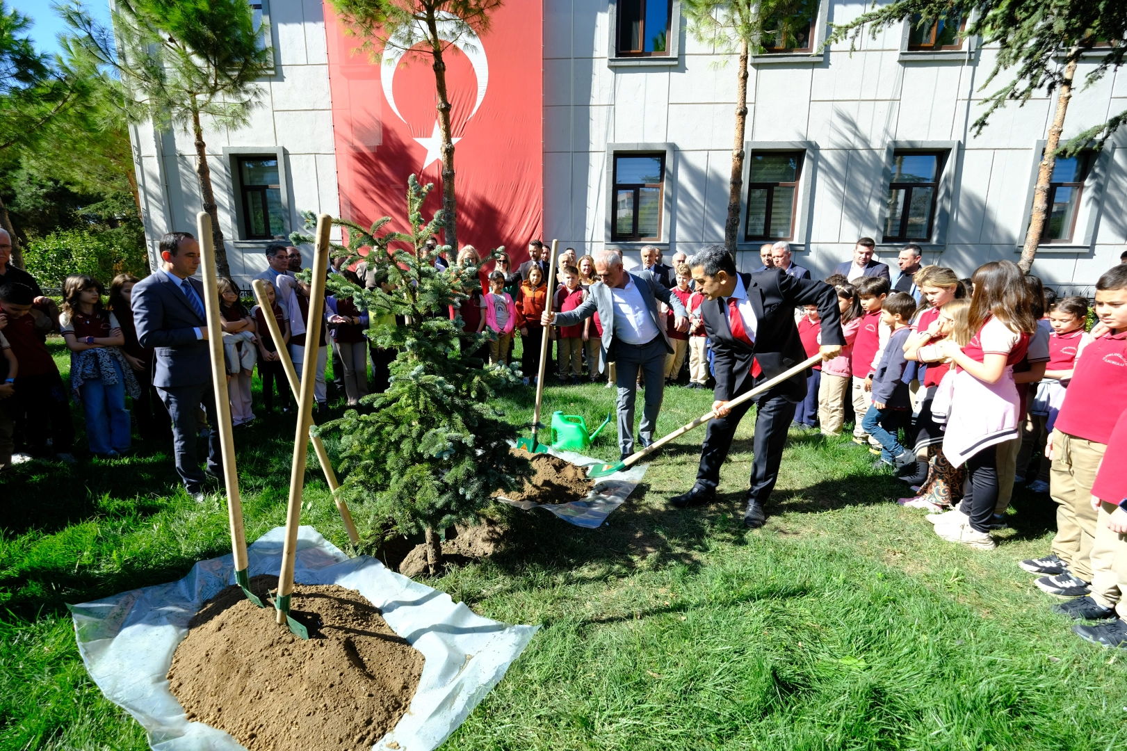 Daha sonra Vali Ekici, kurum müdürleri ve öğrenciler çam fidanlarını toprakla buluşturdu.