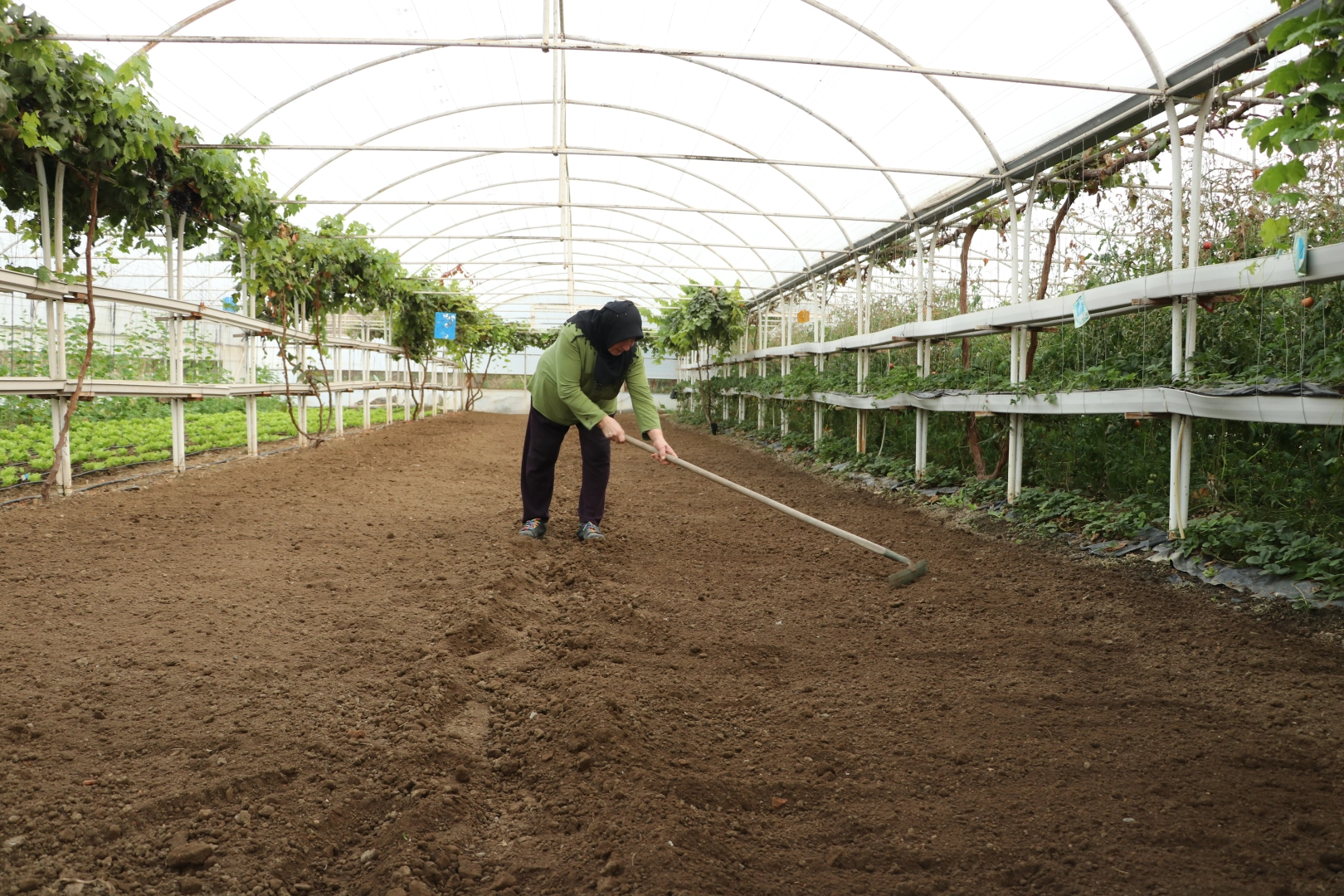 Proje desteklerinden yararlanan Kaya, evinin yanında ürünler yetiştirebileceği 600 metrekarelik sera kurdu.