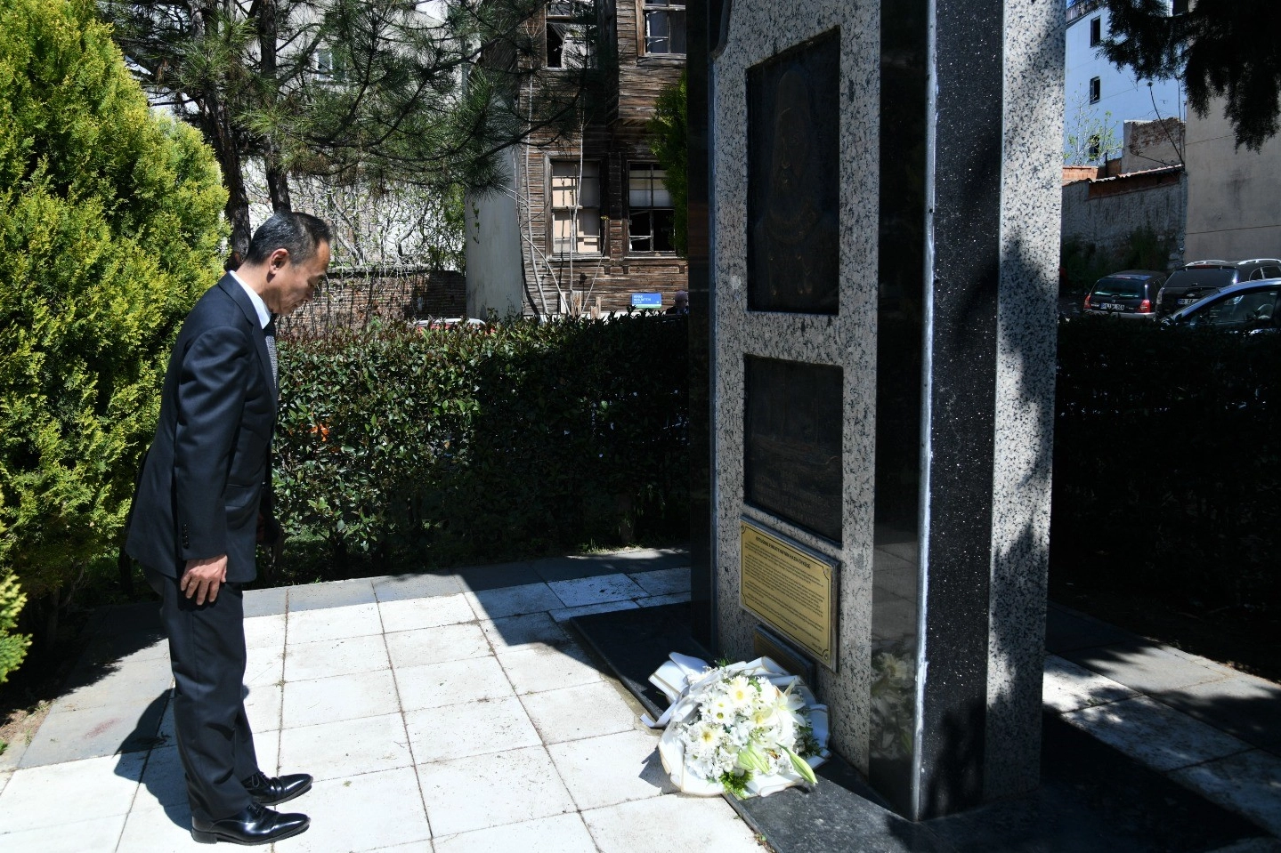 Japonya İstanbul Başkonsolosu Iwama Ryoji, Tekirdağ Valisi Recep Soytürk'ü makamında ziyaret etti. Ziyaretin ardından Başkonsolos Ryoji, İl Müdürü Ömer Faruk Karaküçük refakatinde Osmanlı Devleti döneminde Japonya'dan dönüş yolunda batan Ertuğrul Fırkateyni Faciası şehitlerini anmak amacıyla inşa edilen Yarbay Ali Bey Anıtı'nı ziyaret etti. Anıtta düzenlenen programda, Ertuğrul Fırkateyni'nde hayatını kaybeden asker ve mürettebat adına çelenk sunan Başkonsolos Ryoji, saygı duruşunda bulundu. Osmanlı Padişahı II. Abdülhamid Han 1889 yılında Japon İmparatoru Meiji'ye iade-i ziyaret ve dostluk mesajlarını iletmek üzere Ertuğrul Fırkateyni'ni Japonya'ya göndermişti. Japonya'da üç ay kalan fırkateyn, 15 Eylül 1890'da dönüş yoluna çıktı. Ancak gemi, Japonya açıklarında şiddetli bir kasırgaya yakalanarak 16 Eylül 1890 gecesi kayalıklara çarpıp ikiye bölündü ve battı. Kazada 527 mürettebat şehit olurken, 69 kişi Japon balıkçılar tarafından kurtarıldı. Facianın ardından Japon halkının Osmanlı denizcilerine gösterdiği yardım ve ilgi, Türk-Japon dostluğunun en önemli sembollerinden biri olarak tarihe geçti. Japonya'da şehitler için anıtlar dikilirken, her yıl düzenlenen törenlerle anma programları sürdürülüyor. Tekirdağlı Ertuğrul Fırkateyni süvarisi Yarbay Ali Bey ve diğer şehit denizciler anısına da kentte anıt yapılırken, bir mahalleye de fırkateynin adı verildi.