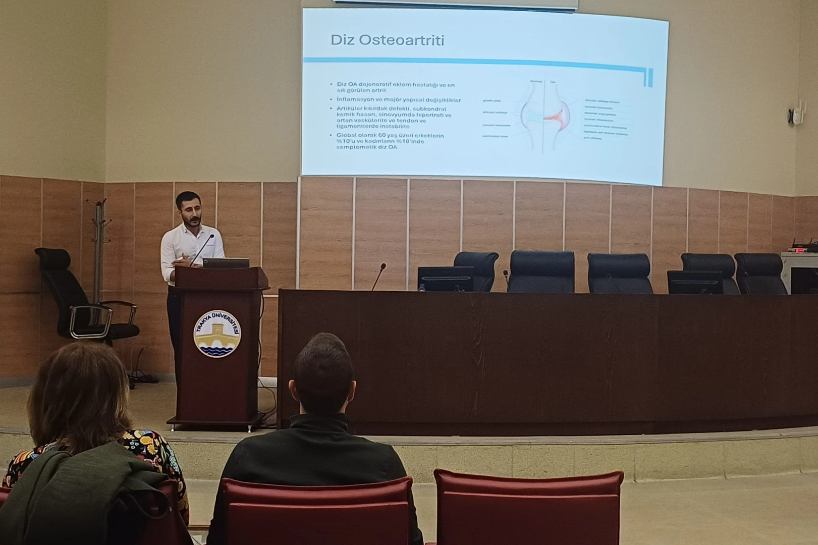 Edirne’de Trakya Üniversitesi (TÜ Sağlık Bilimleri Fakültesi Fiyzoterapi ve Rehabilitasyon Bölümü’nün gerçekleştirdiği seminerlerin sonuncusu “Diz Osteoartriti ve İnstabilite: Biyomekaniden Tedaviye” konusu ile gerçekleştirildi. TÜ Balkan Kongre Merkezi Senato Salonu’nda gerçekleştirilen seminerin konuşmacısı TÜ Sağlık Bilimleri Fakültesi Fizyoterapi ve Rehabilitasyon Bölümü Arş. Gör. Dr. Halit Selçuk oldu. Selçuk, seminerde diz kireçlenmesinin tedavisine dair çalışmalardan bahsedileceğini belirtirken, “Bugün burada tedavi yöntemlerinden bahsedeceğiz. Özellikle instabilite yaşayan kireçlenme hastalarına odaklanacağız. Nasıl tedavi ediliyor ve nasıl bil yol izlenmesi gerektiğine dair çalışmalardan bahsedeceğiz” ifadelerini kullandı.