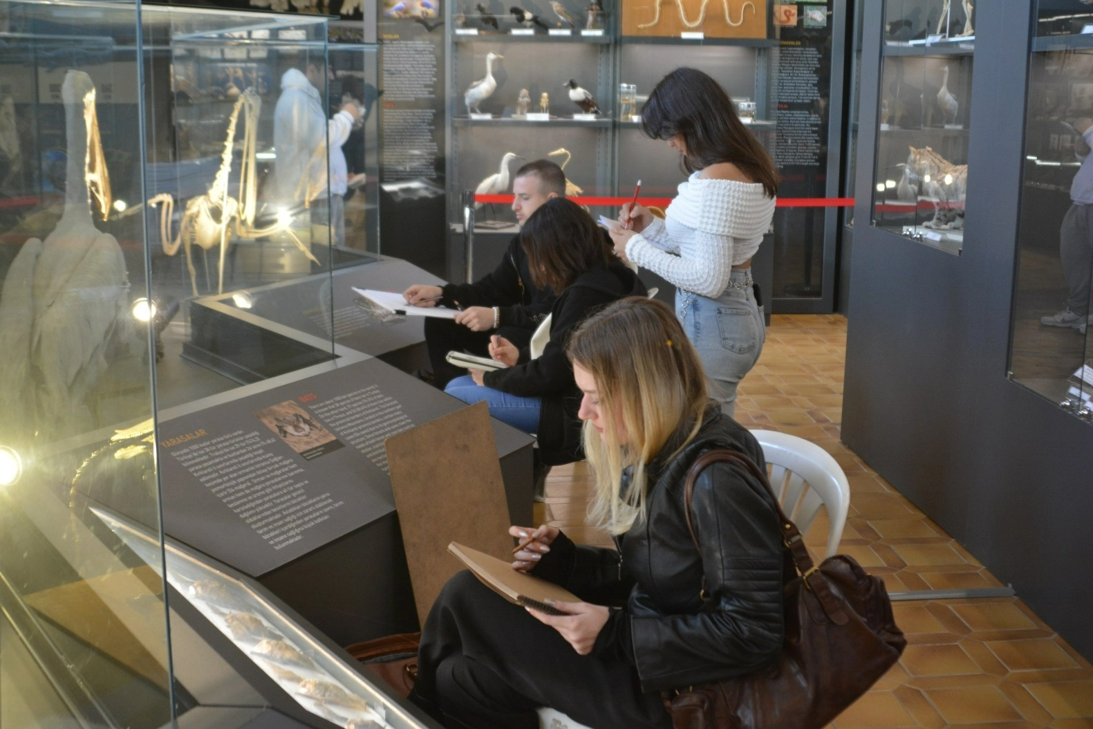 Resim Bölümü Dr. Öğr. Üyesi Ö. Gökhan Temizel’in yönetimindeki öğrenciler, derslerini atölye dışında, Doğa Tarihi Müzesi'nin özgün atmosferinde yaparak desen pratiklerini farklı formlar üzerinde geliştirme fırsatı buluyorlar. Dr. Temizel, müzenin sunduğu imkânların, fakültenin kaynaklarını verimli kullanma açısından oldukça değerli olduğunu vurguladı. Aynı zamanda bu çalışmaların öğrencilerin hem sanatsal becerilerini hem de estetik algılarını zenginleştirdiğini ifade etti.