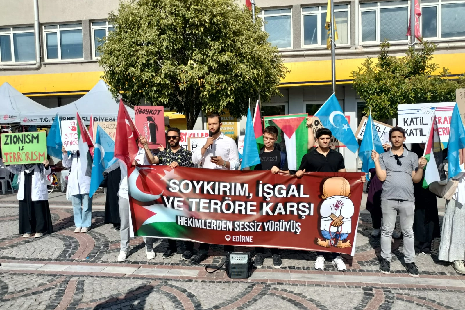 Edirne’de Eski Cami meydanında bir araya gelen öğrenciler, “Soykırım, İşgal ve Teröre Karşı Hekimlerden Sessiz Yürüyüş” yazılı pankart ve dövizlerle Saraçlar Caddesi’ne yürüdüler.