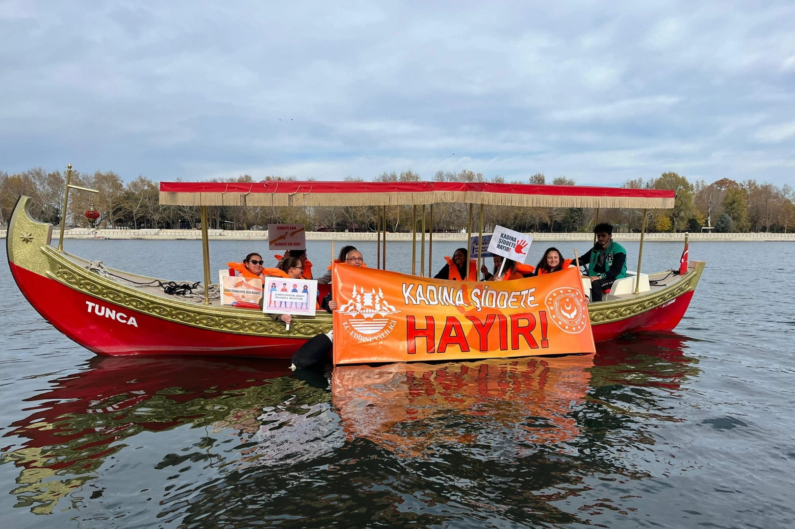 Muhtarlar Meriç Nehri'nde kancabaş tipi kayıkla gezi yaptığı sırada da "Kadına Şiddete Hayır" yazılı pankart açtı.