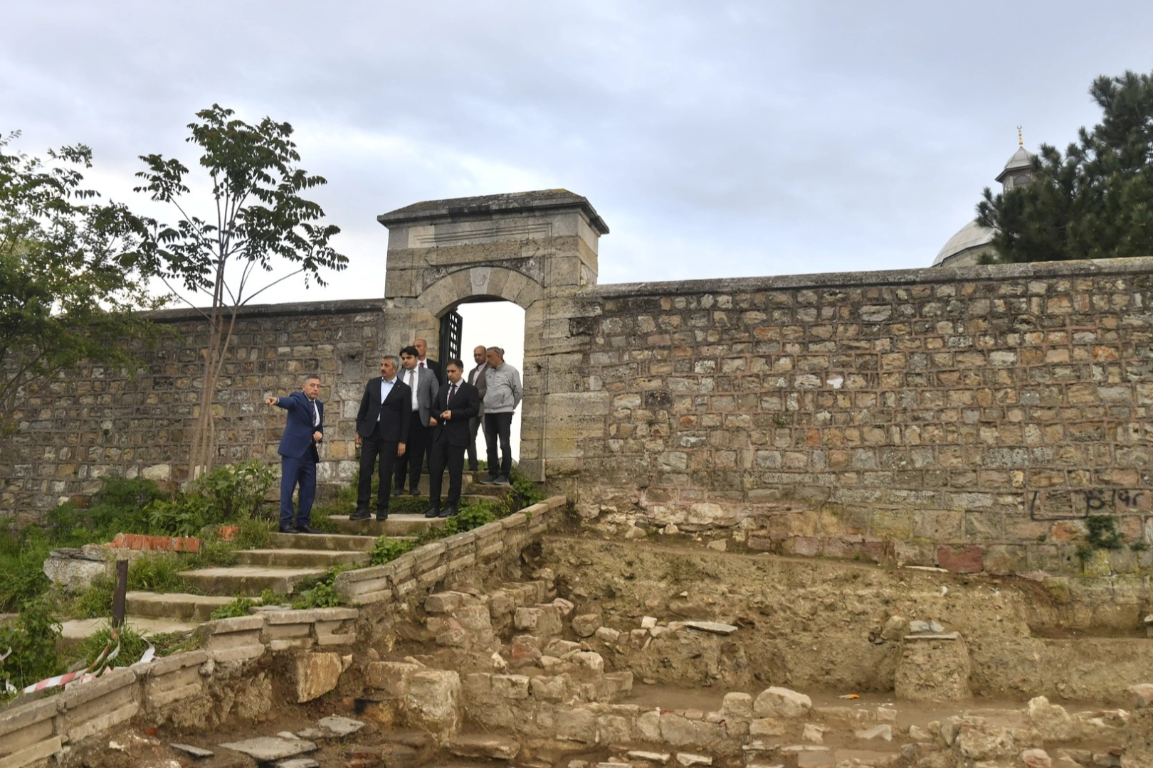 Edirne Valisi Yunus Sezer, restorasyon çalışmaları devam eden Gazimihal ve Yeniçeriler hamamlarındaki çalışmaları incelemesi sonrası yeniden ayağa kaldırma çalışmaları süren Muradiye Camisi bahçesindeki Mevlevihane'ye geçti.