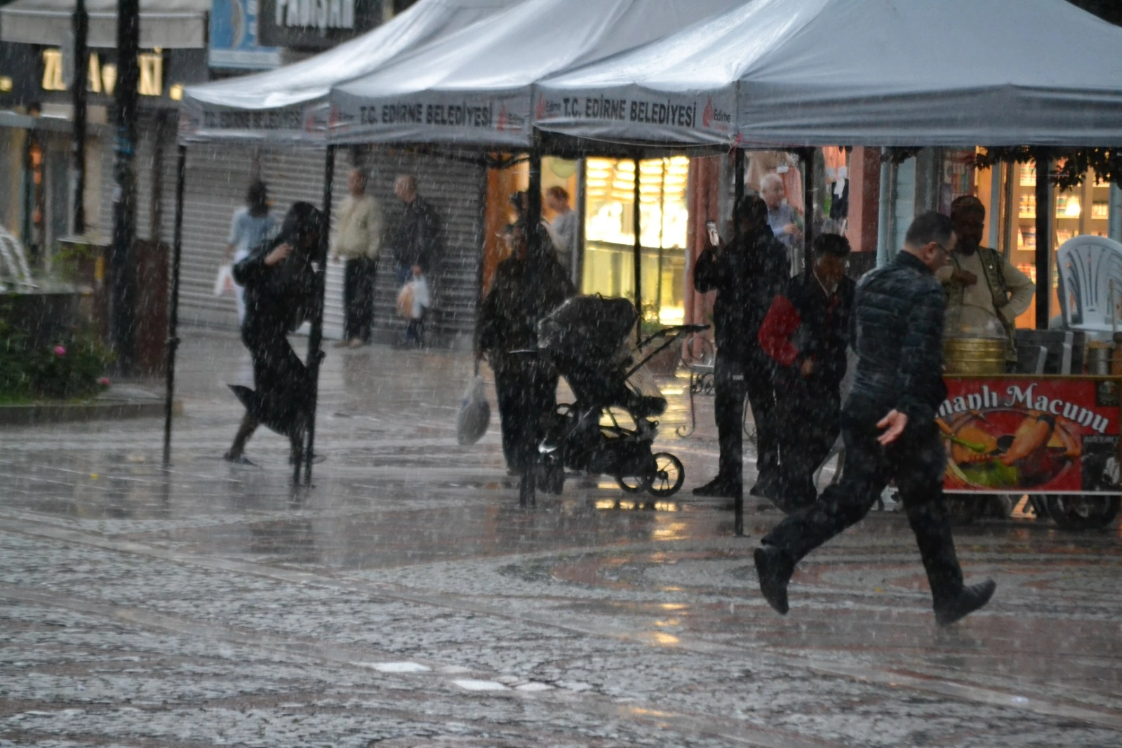 Edirne’de bugün saat 18.20 sıralarında aniden başlayan sağanak yağış, hayatı olumsuz etkiledi. Kentin en yoğun caddesi olan Saraçlar Caddesi’ndeki vatandaşlar, yağmurun başlamasıyla birlikte caddedeki işletmelere kaçtı.