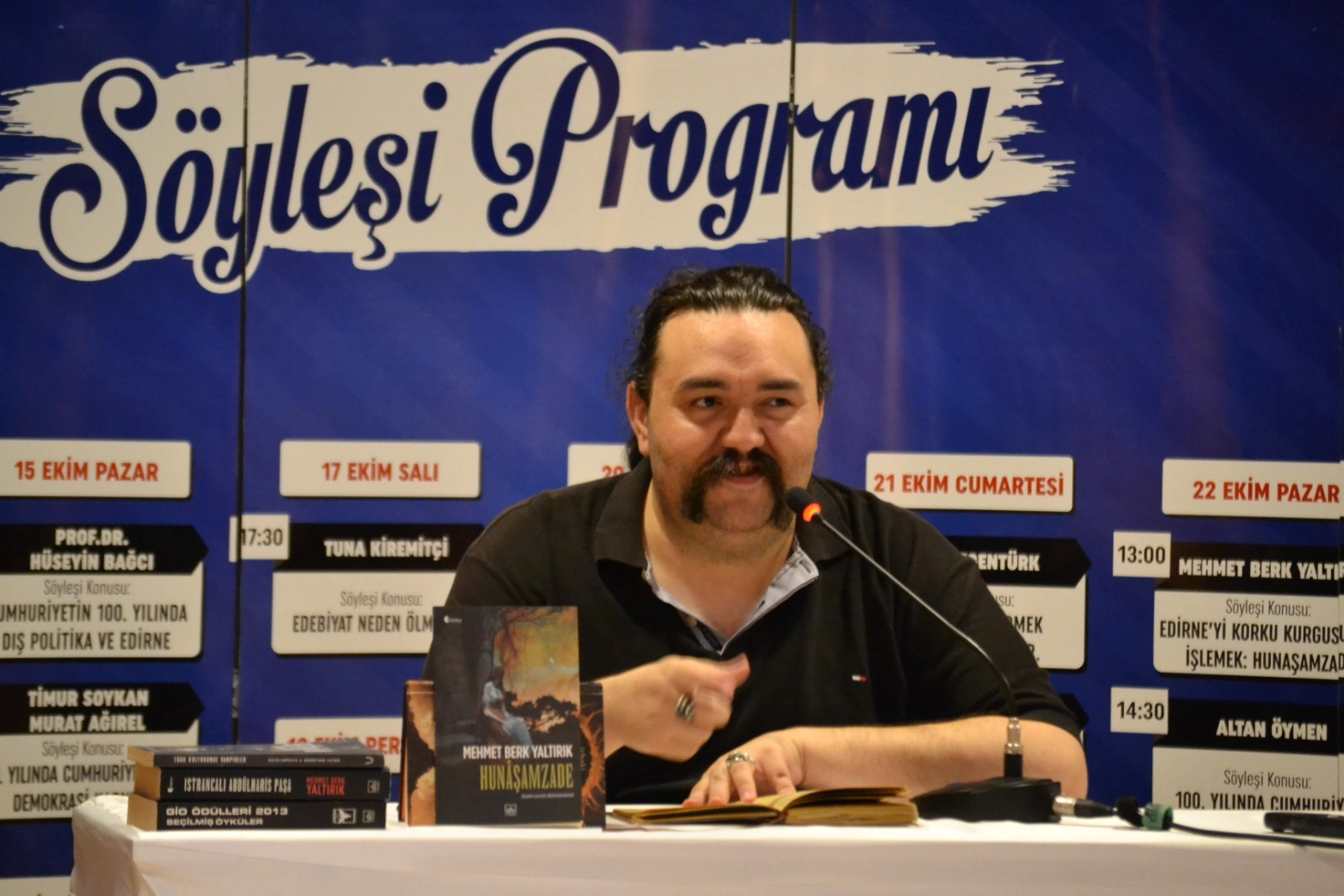 Atatürk Kültür Merkezi (AKM) ve Belediye Konservatuvarı Salonu’nda düzenlenen “Edirne’yi korku kurgusunda işlemek: Hunâşamzade” konulu söyleşide okurları ile bir araya gelen Yaltırık, İthaki Yayınları’ndan çıkan son eseri Hunâşamzade’yi anlattı.