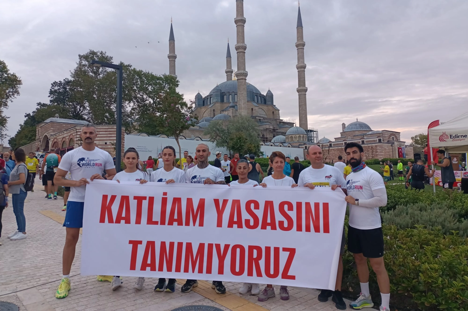 Balkan Ülkeleri Dostluk Grubu Gençlik ve Spor Kulübü Derneği (BÜDDER) tarafından düzenlenen ve Selimiye Camii meydanından başlayan maratonda yaşam hakkı savunucuları, "Katliam yasasını tanımıyoruz" yazılı pankart ile koştular.