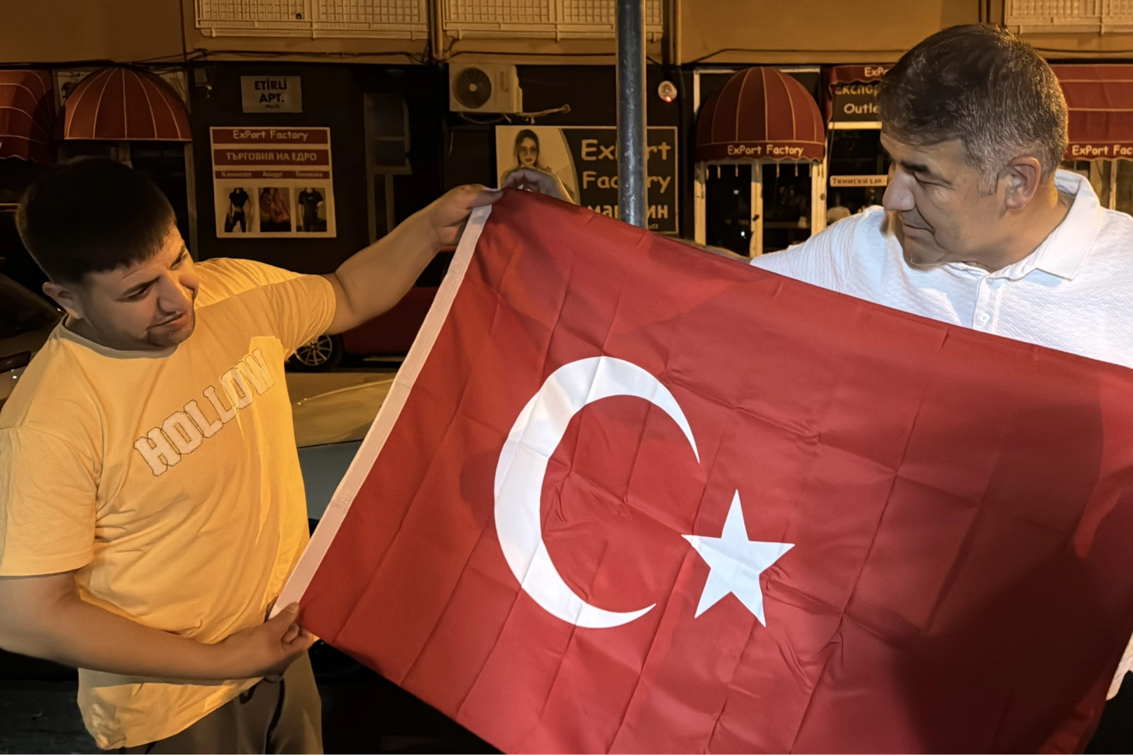 Bu sırada yanına gelen esnaf İkram Uğurlu, iş yerinde Türk bayrağı bulunmadığını belirterek bayrak talebinde bulundu.