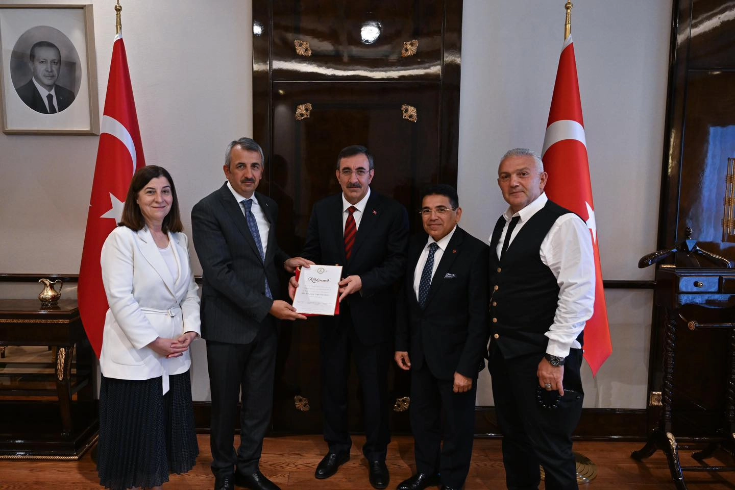 Vali Sezer ve beraberindeki heyet, Cumhurbaşkanı Yardımcısı Sayın Cevdet Yılmaz’a Kırkpınar’ın davet simgesi olan Kırmızı Dipli Mum hediye etti.