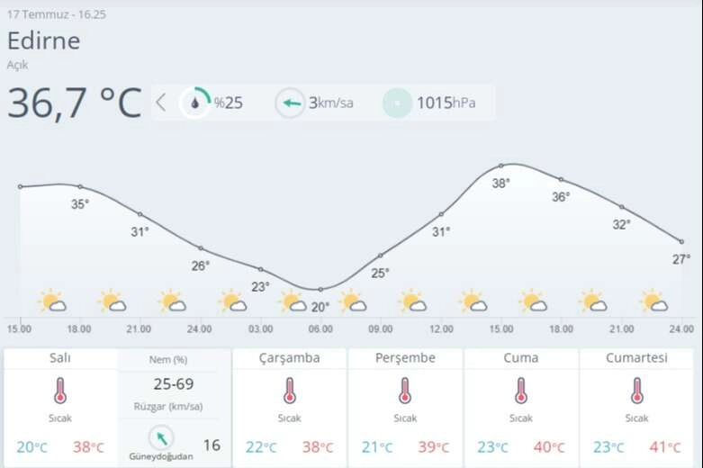 MGM verilerine göre Edirne’de bugün hava sıcaklığı 36,7 derece ölçülürken; yarın ve Çarşamba günü hava sıcaklığı 38 derece, 20 Temmuz Perşembe günü 39 derece, 21 Temmuz Cuma günü 40 derece ve 21 Temmuz Cumartesi günü ise 41 derece olacak.