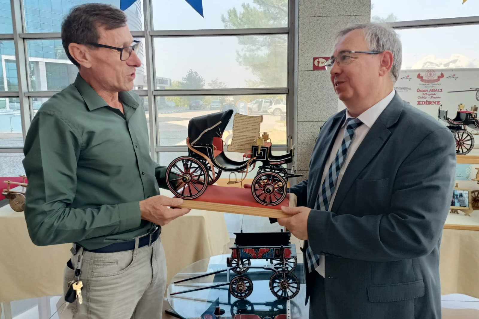 Abacı’nın eserlerinden oluşan standını ziyaret eden isimlerden biri de Trakya Üniversitesi Rektörü Prof. Dr. Erhan Tabakoğlu oldu. Tabakoğlu, Edirne Kırmızılı minyatür faytonu çok beğendiğini belirterek; Abacı ve emeği geçenleri tebrik etti. Abacı da Tabakoğlu’na teşekkür ederken; ilk kez sergilenen Edirne Kırmızılı minyatür faytonu Tabakoğlu’na hediye etti. Edirne Kırmızısı’nın minyatür faytonda kullanılmasından dolayı memnuniyetini ifade eden Tabakoğlu, hediyesi nedeniyle Abacı’ya teşekkür etti.