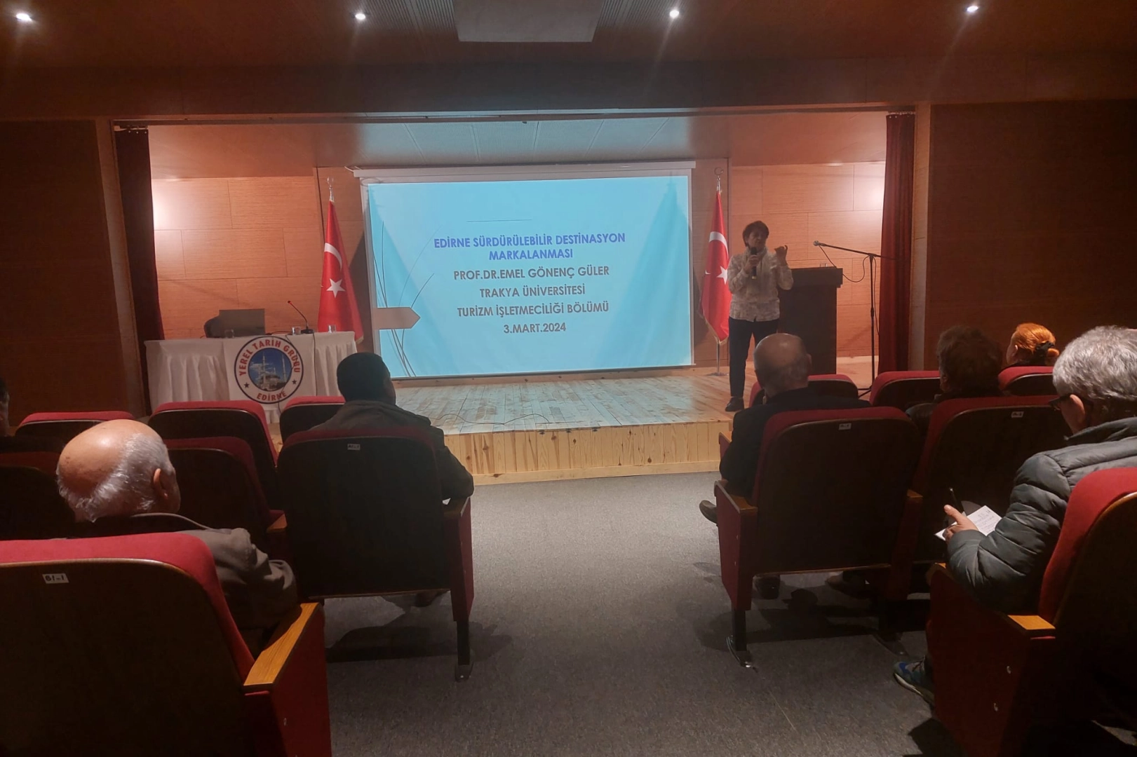 Edirne Yerel Tarih Grubu tarafından Atatürk Kültür Merkezi Küçük Salon’da Trakya Üniversitesi Turizm İşletmeciliği Bölümü Öğretim Üyesi Prof. Dr. Emel Gönenç Güler’in katkılarıyla “Edirne Turizminde Sürdürülebilir Markalar Ve Kent Oluşumu” hakkında söyleşi gerçekleştirildi. Programa Prof. Dr. Emel Gönenç Güler, Edirne Yerel Tarih Grubu Başkanı Güngör Mazlum, Grup Sözcüsü Şükrü Akıllı ve vatandaşlar katıldı.