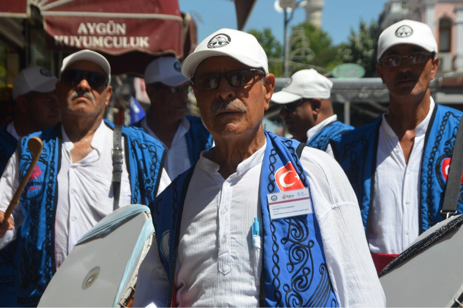 Edirne’de Kırkpınar davul zurna ekibi, 663’üncü Tarihi Kırkpınar Yağlı Güreşleri’ndeki davetlerini sürdürüyor. Toplamda 41 kişilik ekip Saraçlar Caddesi’ndeki esnafları gezerek 4-7 Temmuz’da Sarayiçi Er Meydanı’nda yapılacak olan organizasyona davet ediyor. Davet sırasında esnaflardan bahşiş alan ekip, renkli görüntülere sahne oluyor.