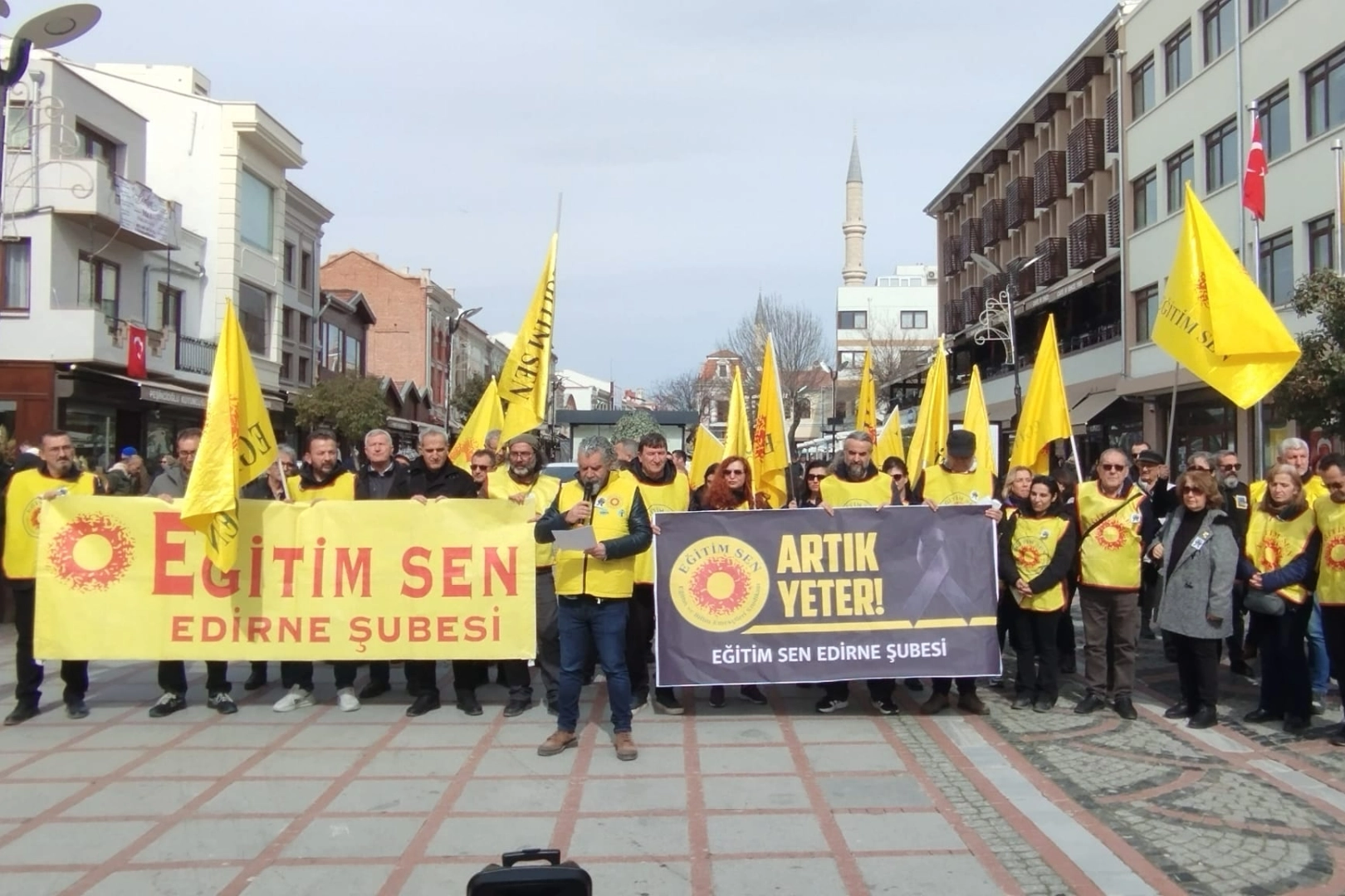 Eğitim-Sen Edirne Şube Başkanı Ahmet Acet’in okuduğu basın açıklamasında okullarda artan şiddet vakalarının çok ciddi bir tehdit oluşturduğu belirtilerek “Bu saldırı münferit değildir. Yaptığımız uyarıları dikkate almayarak, kalıcı ve önleyici politikalar hayata geçirmeyen Milli Eğitim Bakanlığı bu olayın birinci derecede sorumlusudur. Somut ve kalıcı adımlar atılmadığı için şiddet ortamı giderek derinleşmiştir. Bir okulda kesici aletle saldırı gerçekleştirilebilmesi, güvenlik mekanizmalarının yetersizliğini açıkça ortaya koymaktadır. Okullarda şiddeti önleyici destek mekanizmaları ciddi biçimde gözden geçirilmelidir. Şiddetin zemini yalnızca bireysel bir öfke değildir. Medyada, siyasette ve bürokraside giderek meşrulaştırılan sert ve kutuplaştırıcı dil, eğitim emekçilerini hedef gösteren, itibarsızlaştıran ve yalnızlaştıran söylemler bu iklimi beslemektedir. Öğretmenlik mesleğinin sistemli biçimde değersizleştirilmesi, eğitim emekçilerinin kamuoyu önünde haksız biçimde suçlanması ve sorumluluğun sürekli öğretmene yüklenmesi öğretmenleri hedef haline getirmektedir. Ayrıca pedagojik temelden yoksun, eğitimin bilimsel niteliğini gözetmeyen etkinlik ve uygulamaların yaygınlaşması okulu çocuklar ve gençler için güvenli bir öğrenme ortamı olmaktan uzaklaştırmaktadır. Okullar ideolojik yönlendirmelerin, denetimsiz faaliyetlerin ya da pedagojik karşılığı olmayan uygulamaların alanı değildir. Öte yandan derinleşen yoksulluk ve gençlerin geleceksizlik duygusu da şiddet riskini büyüten önemli toplumsal faktörlerdir. Ailesi ekonomik krizle mücadele eden, temel ihtiyaçlara erişimde zorlanan, sosyal destek mekanizmalarından mahrum bırakılan çocuk ve gençlerin yaşadığı psikolojik baskı görmezden gelinemez. Sosyal politikaların zayıflığı, rehberlik ve psikolojik danışmanlık hizmetlerinin yetersizliği bu tabloyu ağırlaştırmaktadır” dedi.