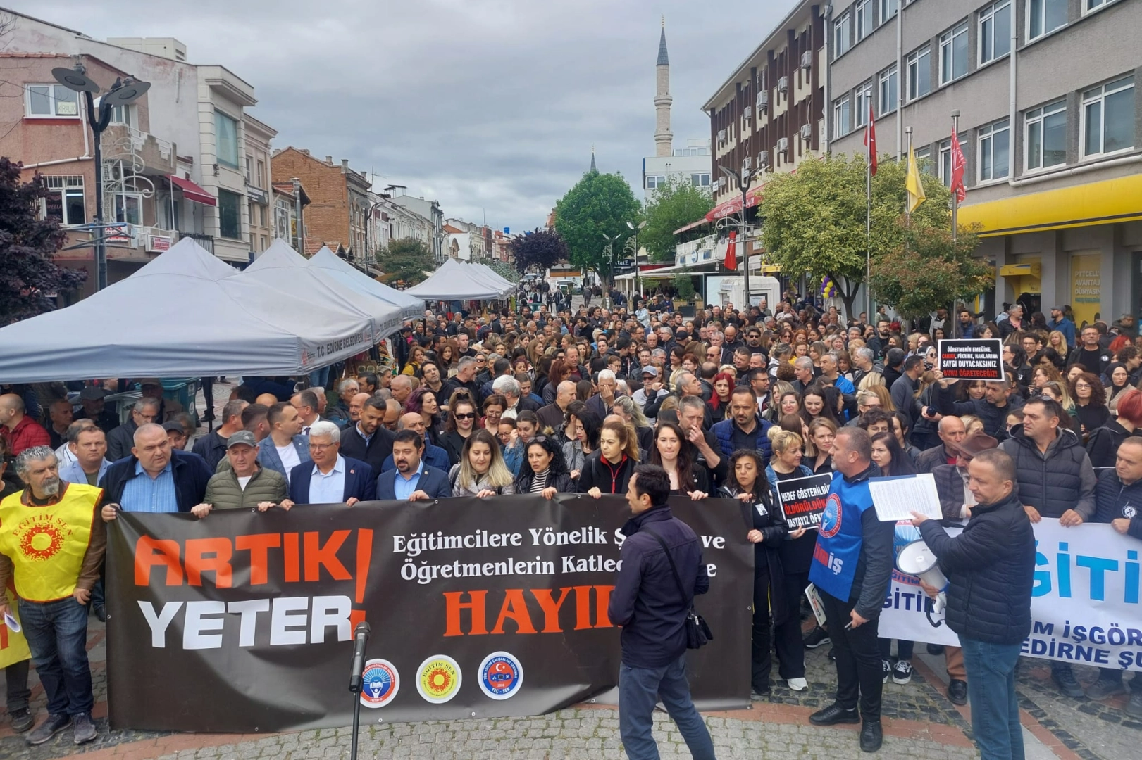 Edirne’de Eğitim ve Bilim İşgörenleri Sendikası, (EĞİTİM-İŞ) Eğitim ve Bilim Emekçileri Sendikası (Eğitim Sen) ve Tüm Eğitim Çalışanları Sendikası’na (TEÇ-SEN) bağlı öğretmenler, Saraçlar Caddesi’nde bir araya gelerek eğitimcilere yönelik şiddete ve öğretmenlerin katledilmesine yönelik bir günlük iş bırakma eylem gerçekleştirdi.