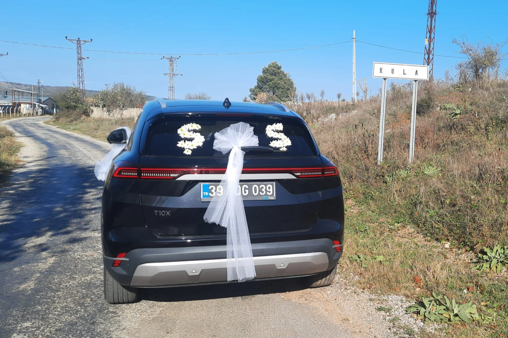 Süslenen Togg ile konvoy eşliğinde genç çift Kula köyünde tur attı.