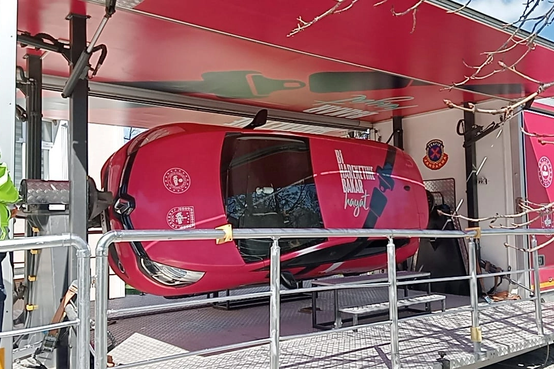 Simülasyon aracına binen vatandaşlar 360 derece döndürülen araçta emniyet kemeri takmanın önemini uygulamalı olarak tecrübe etti.