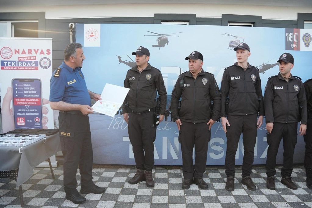 Tekirdağ İl Emniyet Müdürü A. Metin Turanlı, Tekirdağ merkezde görev yapan çarşı ve mahalle bekçilerine 2025 yılı Ocak ayından itibaren gösterdikleri özverili ve gayretli çalışmalar dolayısıyla teşekkür belgesi takdim etti.