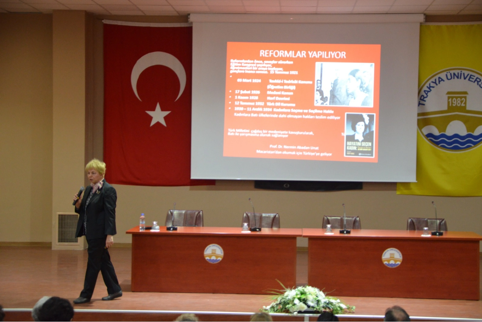 Trakya Üniversitesi Edebiyat Fakültesi Bölümü tarafından düzenlenen ve konuşmacılığını İstanbul Üniversitesi Emekli Öğretim Üyesi Prof. Dr. Sakine Eruz’un yaptığı Atatürk Çokkültürlülük ve Çeviri Konferansı Trakya Üniversitesi İktisadi ve İdari Bilimler Fakültesi Prof. Dr. Fehmi Yıldız Konferans Salonu’nda gerçekleştirdi. Program ilk olarak saygı duruşu ve İstiklal marşı ile başladı.