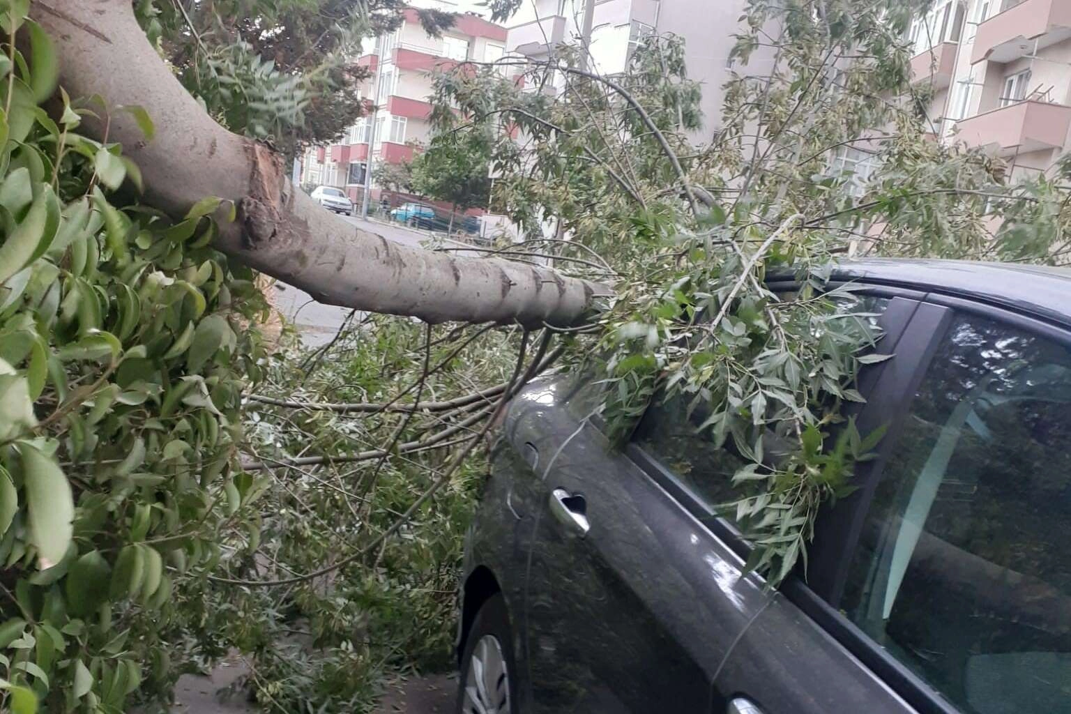 Tekirdağ Kapaklı İsmetpaşa Mahallesi Cumhuriyet Caddesi ve Gaziosmanpaşa Caddesi arasında kalan 61. Sokak üzerinde park halinde bulunan otomobilin üzerine ağaç devrildi.