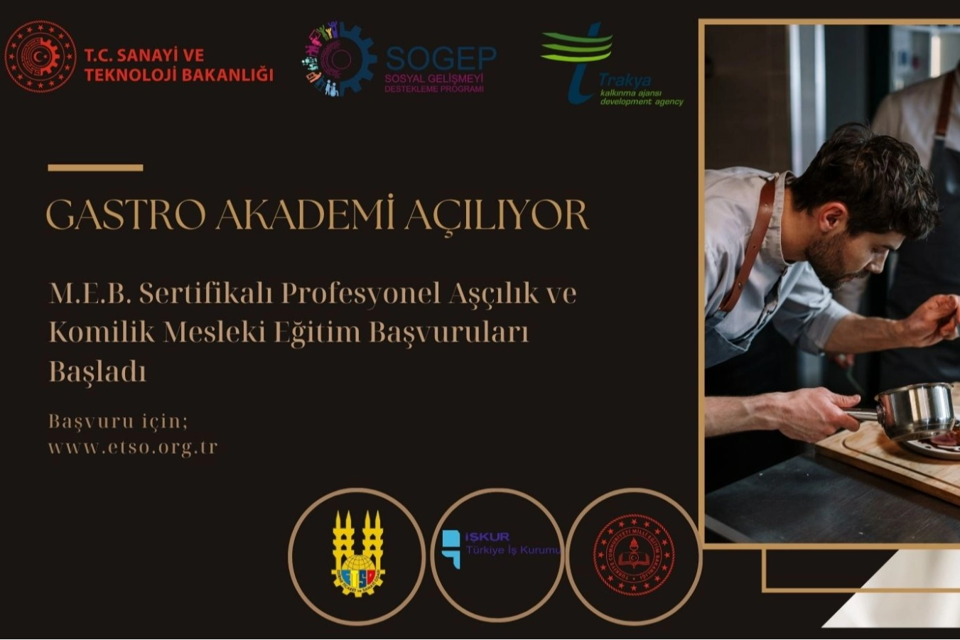 Sanayi ve Teknoloji Bakanlığı’nın 2022 Sosyal Gelişmeyi Destekleme Programı (SOGEP) kapsamında Trakya Kalkınma Ajansı’nın desteği ile Edirne Ticaret ve Sanayi Odası (ETSO) tarafından Edirne İşkur İl Müdürlüğü ve Milli Eğitim Müdürlüğü ortaklığında yürütülen ve bir süredir ETSO hizmet binasında inşası devam eden “Gastro Akademi ile Gelecek Mutfakta” projesi tamamlandı.