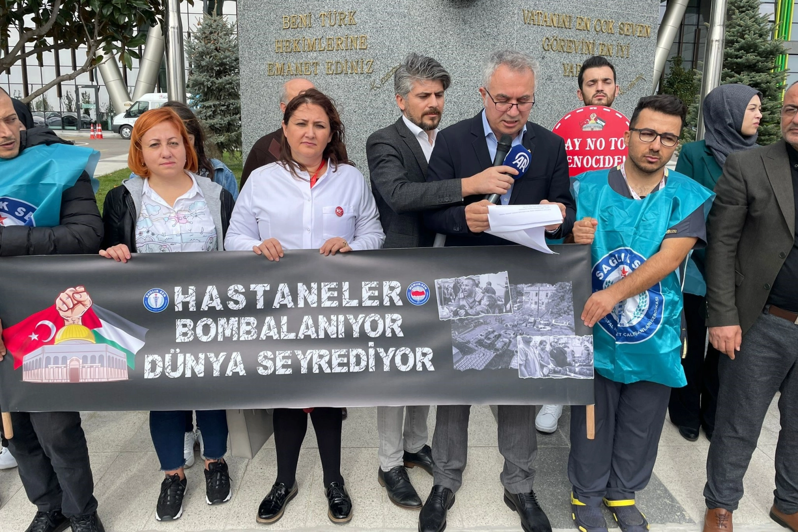 Tekirdağ'da sağlık çalışanları İsrail'in Gazze'ye yönelik saldırılarını protesto etmek için Tekirdağ Dr. İsmail Fehmi Cumalıoğlu Şehir Hastanesi önünde bir araya geldi. Hastane önünde bir araya gelen Sağlık-Sen Tekirdağ Şubesi üyeleri, "Soykırıma hayır", "Bebekler ölüyor dünya susuyor", "Dünya susuyor hastaneler bombalanıyor" yazılı pankartlarla İsrail'e tepkisini dile getirdi. Sağlık-Sen Tekirdağ Şubesi Başkanı Hüseyin Avni Yeniay, toplanan sağlık çalışanları adına yaptığı açıklamada, “Sağlık-Sen olarak yaşanan bu vahşete kayıtsız kalmamız mümkün değildir. Bu soykırımı görmezden gelmemiz imkansızdır. Sivil ve masum insanlara yönelik saldırıları nefretle kınıyor, hayatlarını kaybeden Filistinli kardeşlerimize Allah'tan rahmetler diliyor, yaralılara şifalar temenni ediyoruz. Gazze'de insanlık, dünyanın gözleri önünde katlediliyor. Parçalanan bebek bedenleri yüreklerimizi dağlıyor, evladının cenazesini, bacağına yazdığı yazı ile bulan babanın acısı ciğerimizi yakıyor. Katledilen annesini saçından teşhis eden kız çocuğunun feryadı içimizi acıtıyor" dedi.