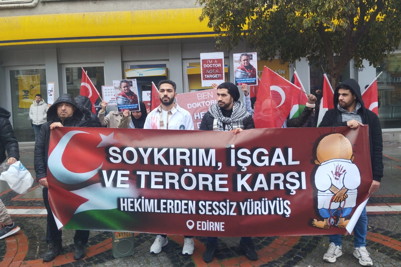 Her Cumartesi günü Trakya Üniversitesi Tıp Fakültesi öğrencileri ve sağlık çalışanlarının, İsrail’in Gazze saldırılarına karşı yaptıkları sessiz yürüyüşün 11’incisi Edirne’de yağmurlu havaya rağmen devam etti. Eski Cami önünde toplanan kalabalık, buradan Saraçlar Caddesi’ne yürüdü. Saraçlar Caddesi’nde postane önünde basın açıklamasa yapan kalabalık, İsrail mallarına boykot çağrısı yaptı.