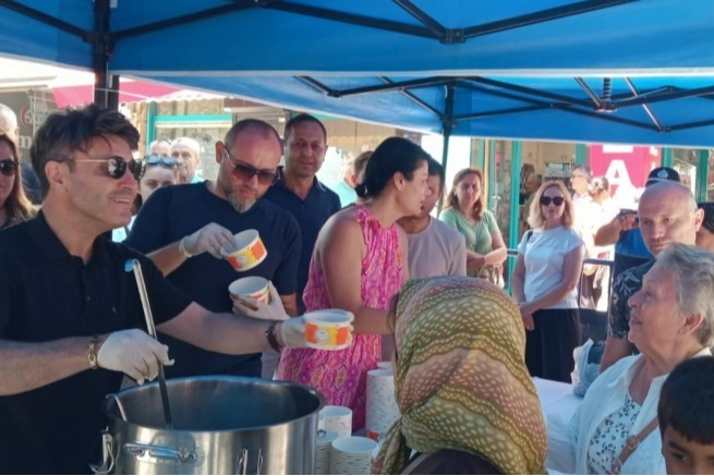 Belediye ek hizmet binası önünde düzenlenen etkinlikte Belediye Başkanı Ali Kamil Soyuak, başkan yardımcıları Süleyman Burak Batır ve Birol Gez ile belediye personeli vatandaşlara aşure ikram etti.