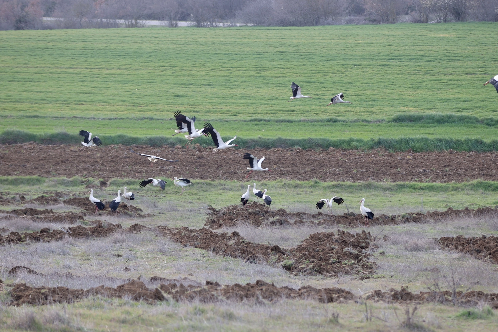 Göç yolundaki leylekler Kırklareli'nin Vize ilçesi yakınlarındaki tarım alanına indi.