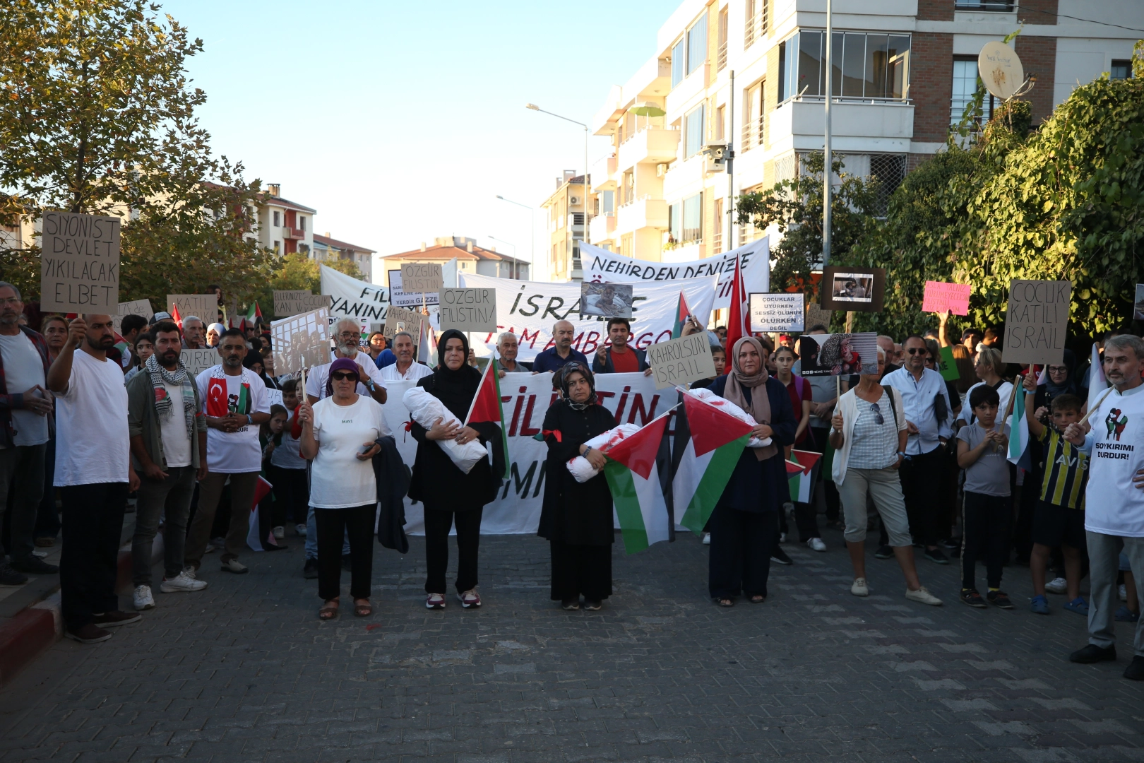 İnönü Caddesi'nde toplanan vatandaşlar, Filistin bayrakları açarak ve Gazze'de hayatını kaybedenlerin fotoğraflarının yer aldığı pankartları taşıyarak ilçe merkezine yürüdü.