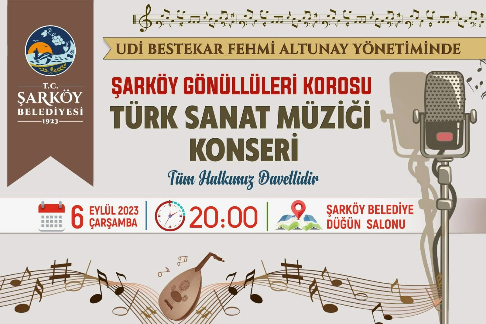 Şarköy Belediyesi'nin katkılarıyla düzenlenecek olan Udi Bestekar Fehmi Altunay yönetimindeki Şarköy Gönüllüleri Korosu Türk Sanat Müziği Konseri 6 Eylül 2023 Çarşamba (bugün) Şarköy Belediye Düğün Salonunda saat 20.00’da gerçekleştirilecek.