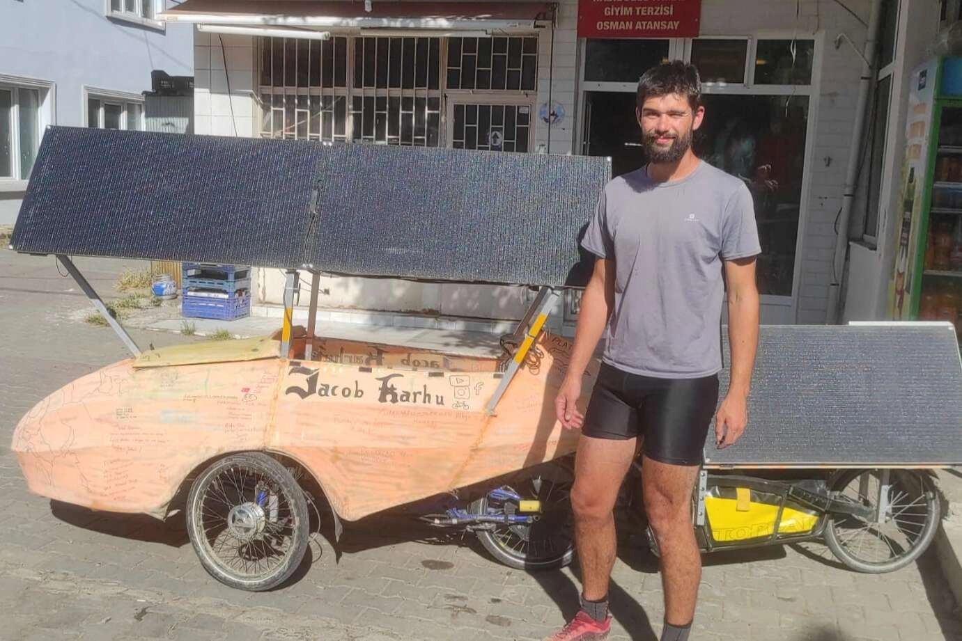 Fransa’nın Paris şehrinde yaşayan Fas asıllı Jacob Karhu, kendi yapımı olan ve tamamen güneş enerjisiyle çalışan ilginç aracıyla binlerce kilometre yolu aşarak İstanbul’a geldi. İstanbul’da bir süre gezen Karhu, geri dönüş yolunda Kırklareli’nin Vize ilçesine bağlı Sergen köyünde mola verdi. Paris Üniversitesi İklim ve Çevre Bilimleri alanında Çevre ve İklim Değişikliği üzerine doktora eğitime devam eden Karhu, iklim değişikliğine dikkat çekmek ve çevreci araçların önemini göstermek amacıyla tamamen kendi yapımı olan, güneş enerji panelleriyle enerjisini güneşten alan aracıyla Paris’ten yola çıkarak İstanbul’a geldi. Panellerin yetersiz kaldığı durumda pedallarını kullandığı aracıyla seyahat eden Karhu, İstanbul’a hayran kaldığını belirterek misafirperverlikleri için Türk halkına teşekkür etti.