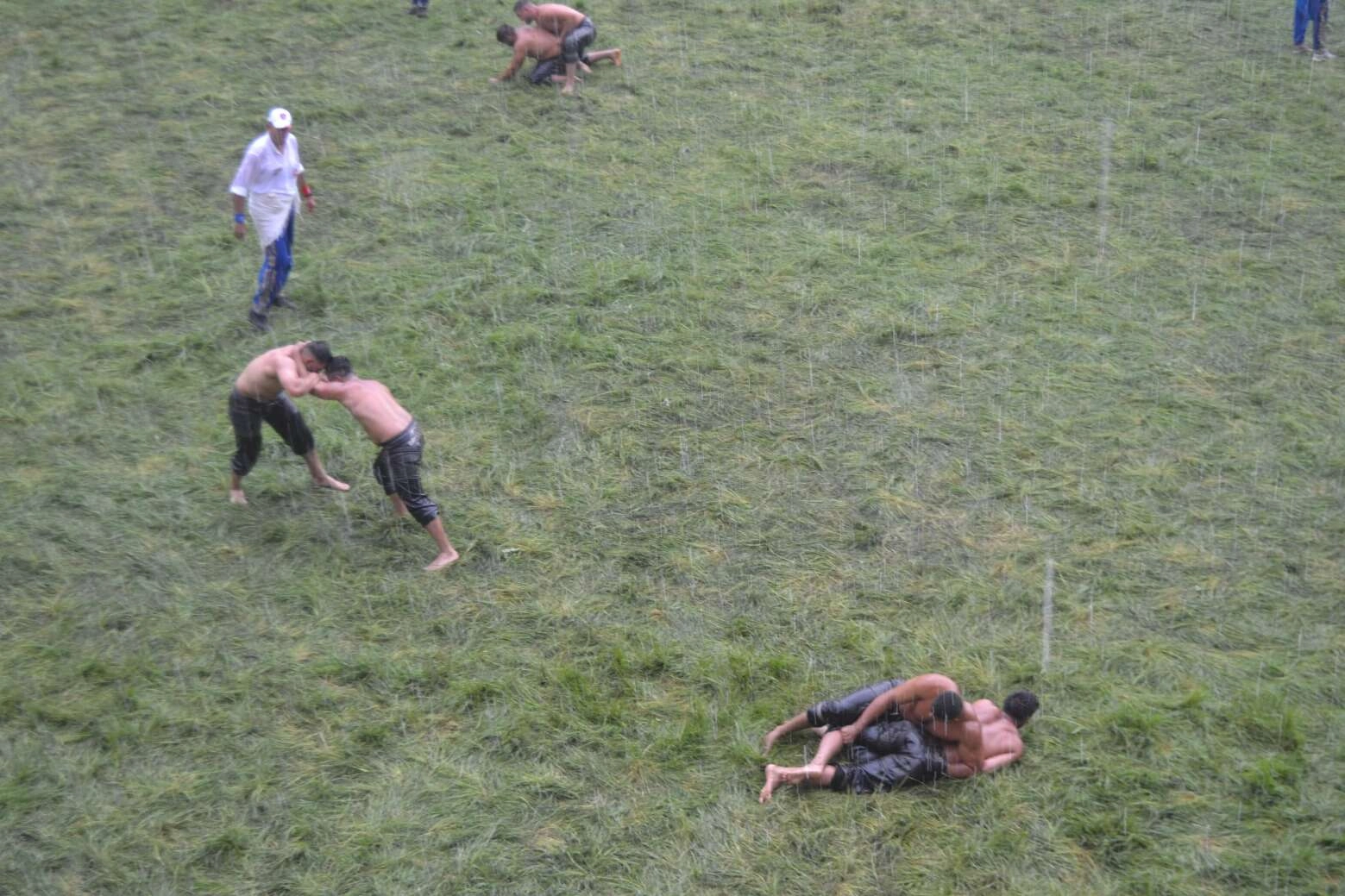 Şiddetli yağışa rağmen güreşler devam etti.