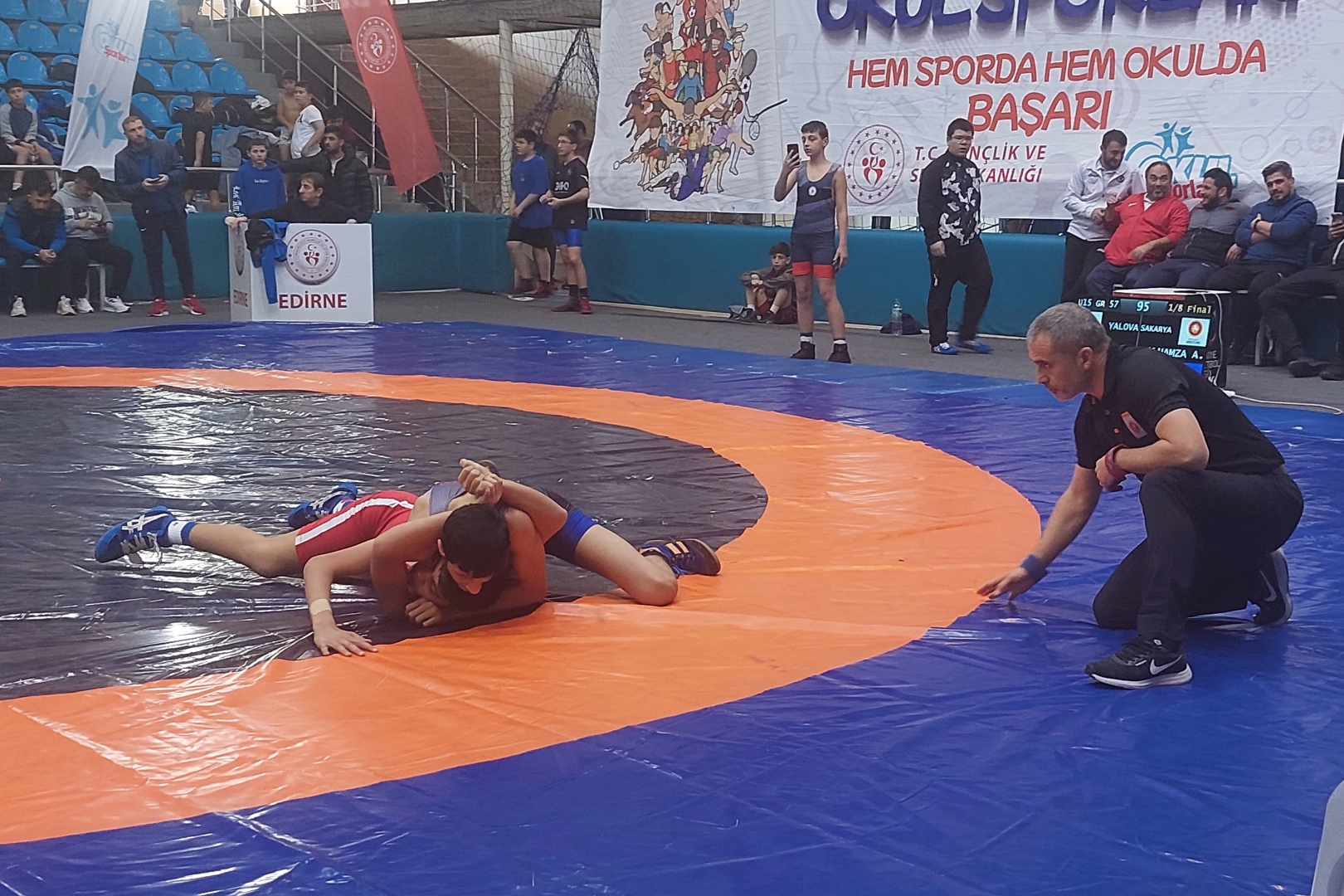 Edirne Mimar Sinan Spor Salonu'nda Okul Sporları Güreş Yıldız Erkek Serbest Grekoromen Stil Grup karşılaşmaları devam ediyor.