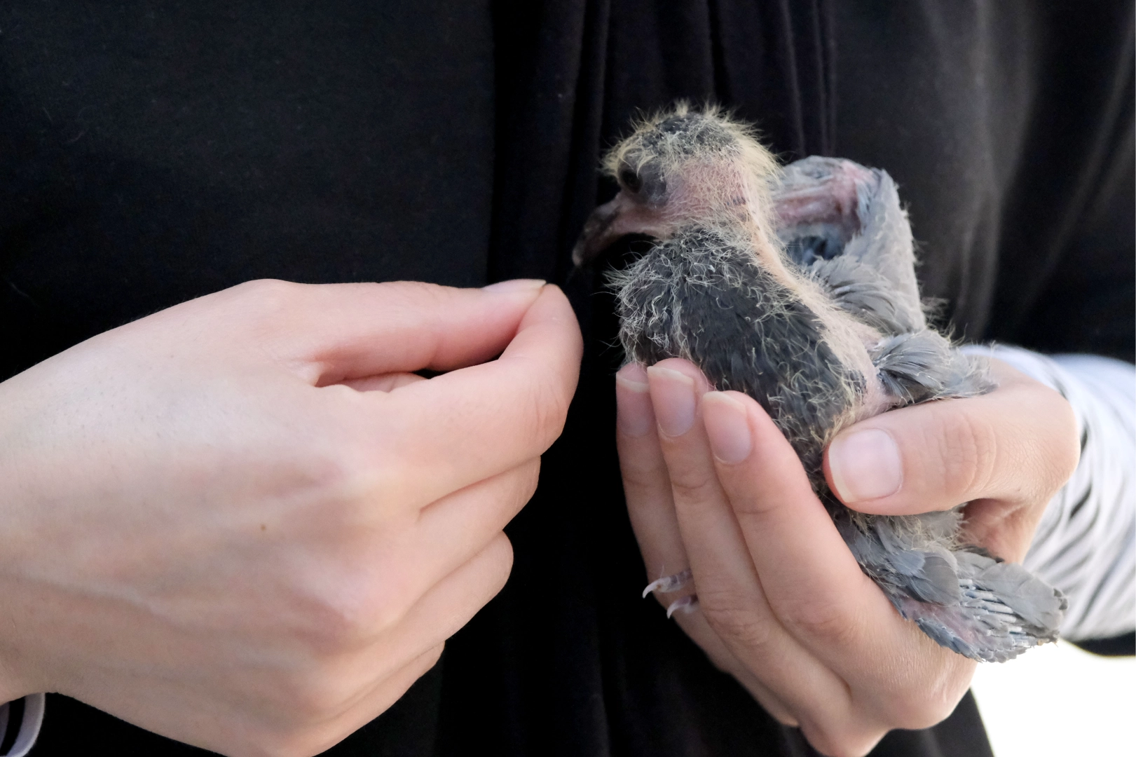 Ayaklarına dolanan ip makasla kesilen güvercin ve yavrusu, tedavi ve kontrol için veterinere götürüldü.